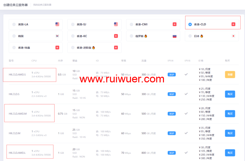 登陆面板后选择创建经典云服务器,选择香港-CLD,选择套餐名字自AMD的