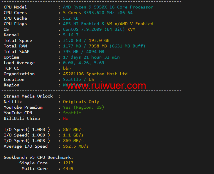 本文针对西雅图机房高防vps,AMD Ryzen 5950X KVM VPS做一个配置信息,硬件性能,线路丢包,流媒体解锁等做一个简单测评,以便大家购买的时候可以参考