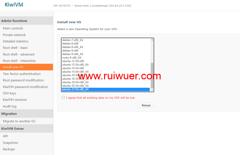进入 KiwiVM 控制面板之后,在左侧菜单栏的 Install new OS 里面就可以看到重装选项,包括了 Ubuntu-22.04-x86_64,选上这个选项之后就可以重装了。