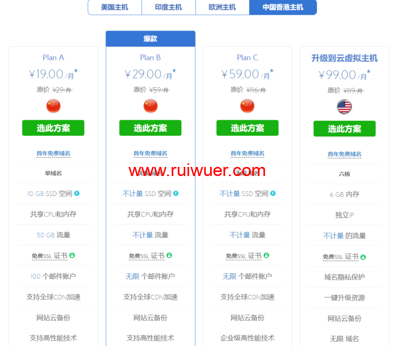 BlueHost虚拟主机根据地域分为美国主机、印度主机、欧洲主机和中国香港主机,每一个套餐价格都一样,不过配置有所变化,建议大家在购买的时候一定要考虑到自己站点的定位及用户群所在地,优先选择靠近用户群的地域,如做印度外贸的则建议选择印度主机。