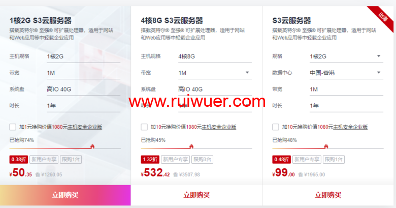 目前华为云最便宜的服务器就是“限时秒杀专区”中的云服务器,如下图所示,国内云服务器1核2G仅需50.35元/1年,免备案香港S3云服务器1核2G仅需99元/1年。