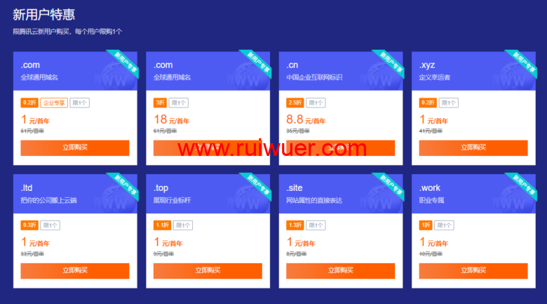腾讯云:域名专场特惠, 域名首购1元起,.cn域名新用户仅需8.8元,下单即送免费版证书和解析