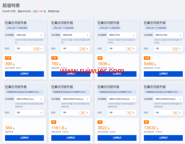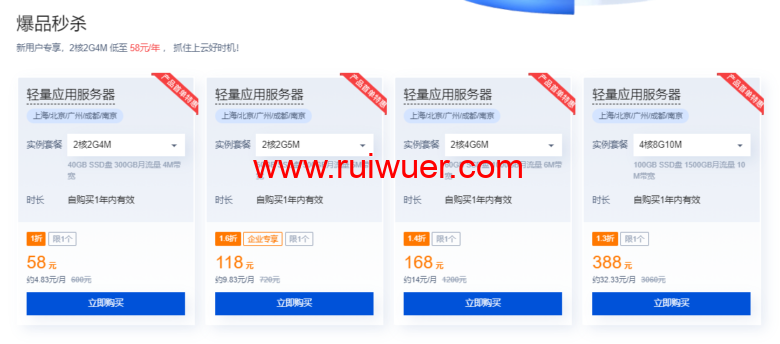 首先是爆品秒杀,有一些大陆地区的轻量应用服务器秒杀,包括上海、北京、广州、成都、南京等地区。