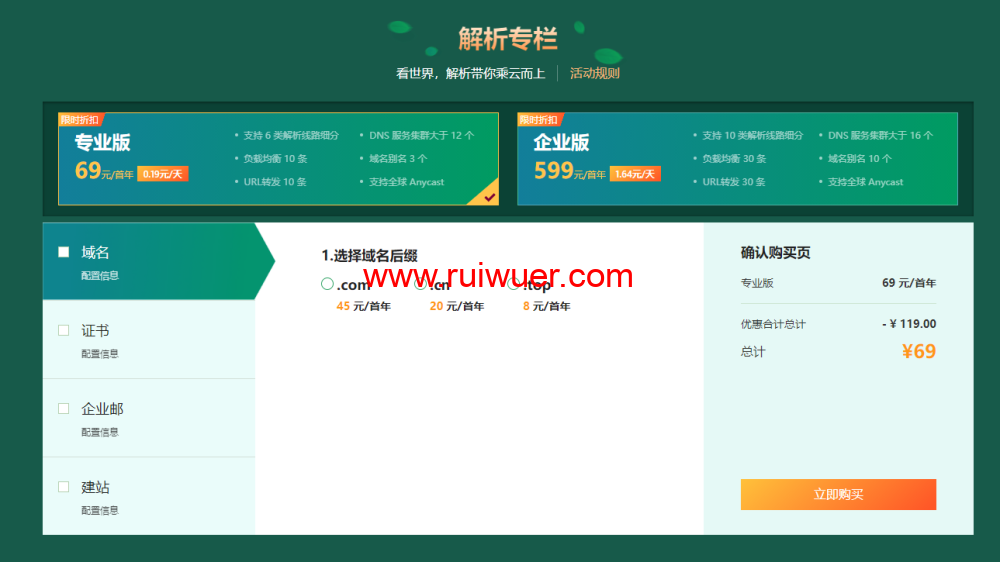 DNSPod是中国第一大DNS解析服务提供商、第一大域名托管商。它除了实时生效、不限制用户添加的域名和记录数量、提供URL转发、搜索引擎优化、域名共享管理、域名锁定、IPv6的支持、动态域名解析、API接口、批量修改管理等先进功能外,还拥有:云DNS、DNSPod DNS Protector(DNSPod 自主研发的DNS 防护软件)、宕机监控、安全中心、7*24小时专业技术支持。并且所有功能都是免费向所有用户提供。
