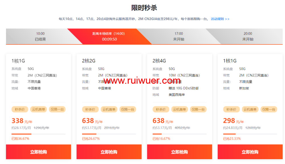 每天10点,14点,17点,20点4款海外云服务器开秒,2M CN2 GIA低至298元/年,每个新客限购一台