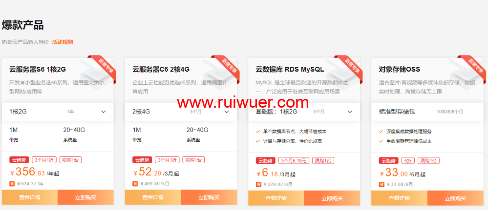本次活动提供的爆款产品涵盖了云服务器、云数据库、对象存储、短信套餐包、商标注册和 LOGO 设计等诸多产品服务,以云服务器为例, 1 核 2G内存 1M 带宽的云服务器S6 一年费用仅需 256.83 元,而 2 核 4G 内存 1M 带宽的云服务器 S6 仅需 751.68 元。