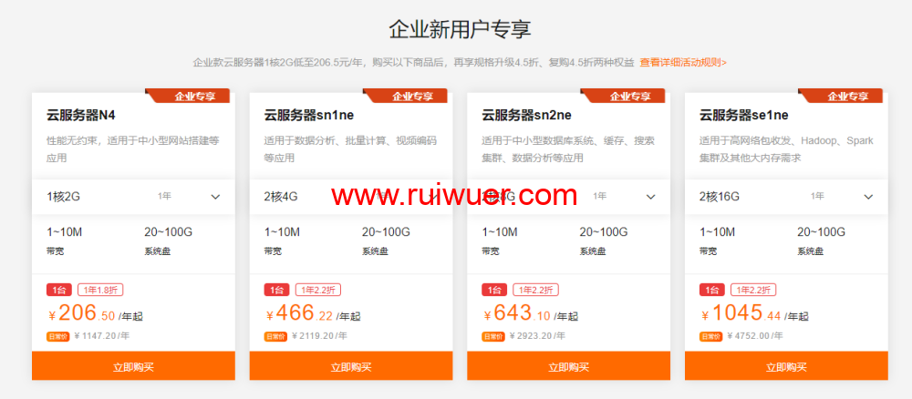 企业款云服务器1核2G低至206.5元/年,购买以下商品后,再享规格升级4.5折、复购4.5折两种权益
