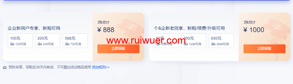 首先是可以领取 1000 元超值代金券,如果是企业新用户,还可以额外再领取 888 元代金券。(点击直达)