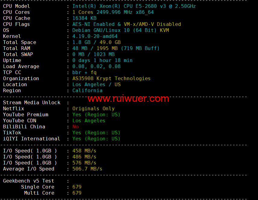 KVM虚拟,纯SSD阵列,1Gbps带宽,线路:三网回程走联通AS4837