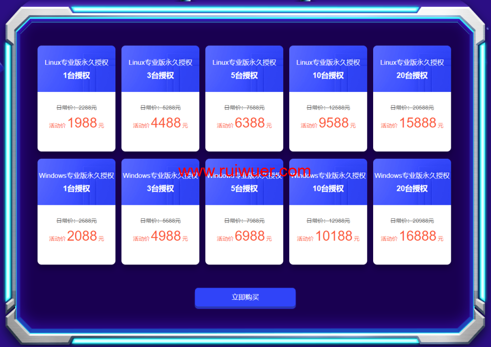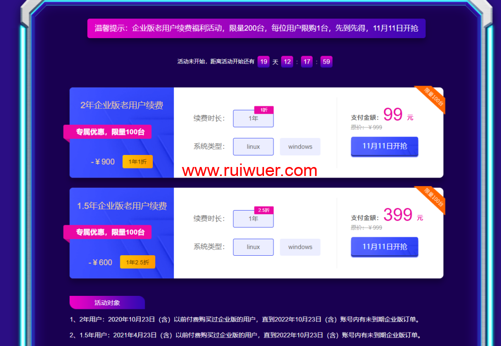 1、Linux/windows专业版为永久授权套餐。2、活动产品不参与返现,不支持补差价升级。3、活动产品,不支持退款。可开发票,登录后台自助申请。4、活动截止日期:2022年11月11日 23:59:59。