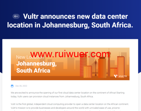 Vultr 是第一家在非洲大陆开设数据中心的全球独立云计算提供商。 Vultr 的使命是为世界各地的企业和开发人员提供无与伦比的易用性、性价比和全球影响力。 这一使命的一个基本部分是不断扩大我们的全球足迹,特别是在世界上服务欠缺的地区。 凭借我们位于约翰内斯堡的新地点,Vultr 进一步使南非和更广泛地区的企业和开发人员能够以负担得起的方式访问高性能云计算。