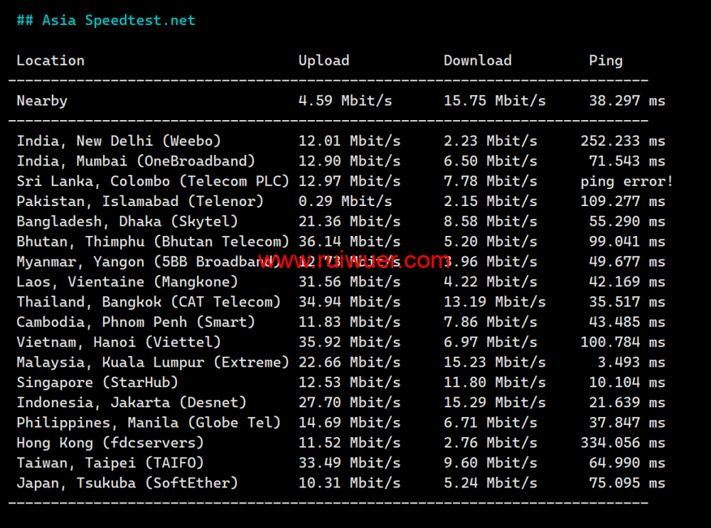 Speedtest亚洲节点上行下行测试: