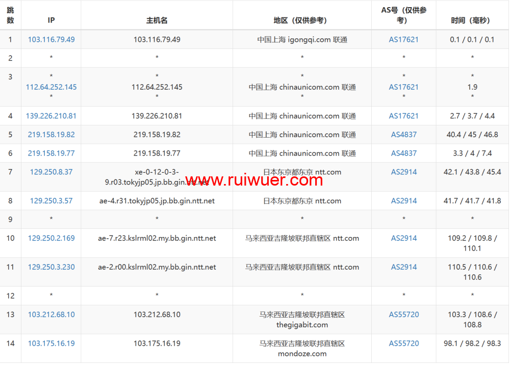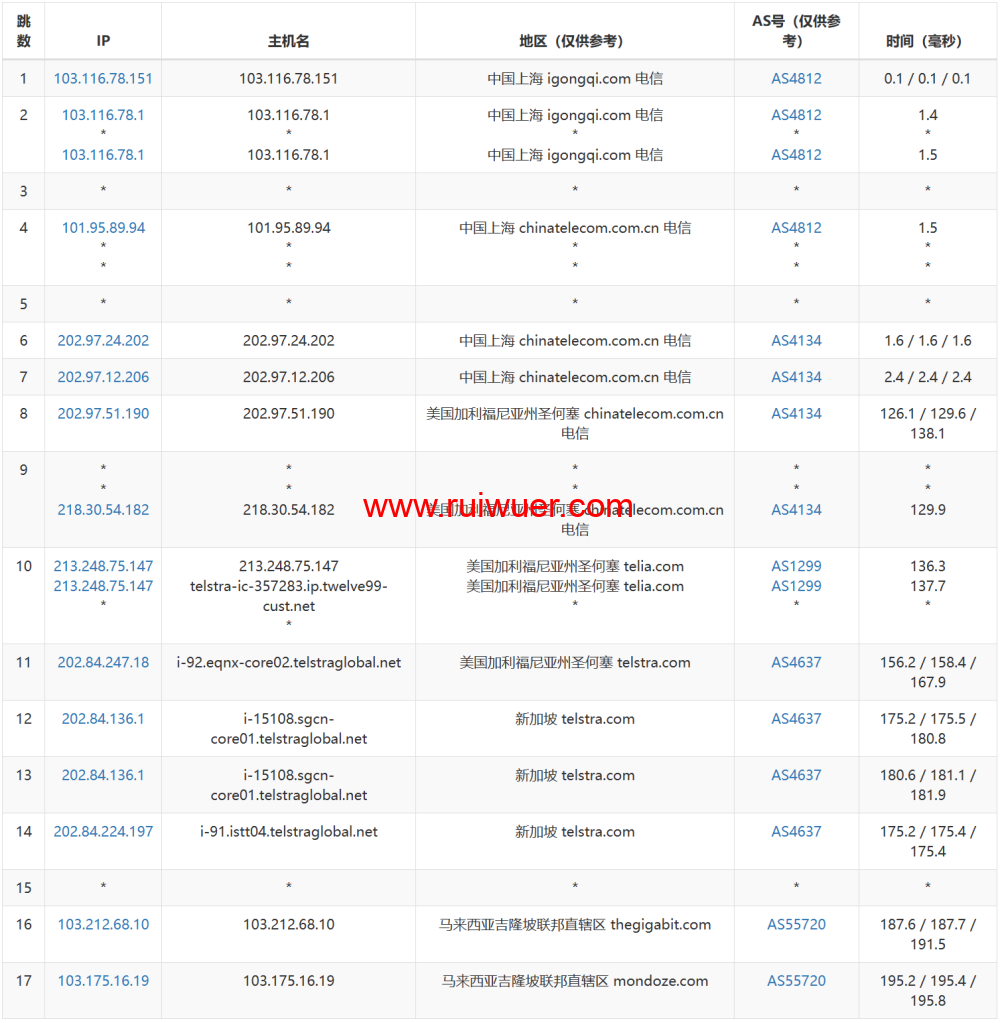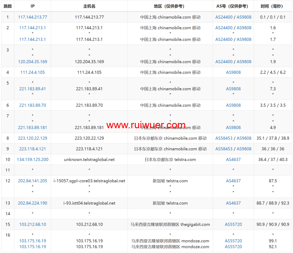 START -------------------- Round 1 - SuperTrace 路由到 - 北京电信 -------------------- traceroute to 106.37.68.26 (106.37.68.26), 30 hops max, 32 byte packets 1 103.212.69.194 1.04 ms AS55720 Malaysia, Kuala Lumpur, thegigabit.com 2 * 3 unknown.telstraglobal.net (202.127.73.209) 11.37 ms AS4637 Singapore, telstra.com 4 i-91.sgcn-core01.telstraglobal.net (202.84.224.198) 11.13 ms AS4637 Singapore, telstra.com 5 i-91.sgcn-core01.telstraglobal.net (202.84.224.198) 41.59 ms AS4637 Singapore, telstra.com 6 i-15251.hkth-core03.telstraglobal.net (202.84.141.110) 39.55 ms AS4637 China, Hong Kong, telstra.com 7 202.84.153.38 79.20 ms AS4637 China, Hong Kong, telstra.com 8 203.215.232.185 184.79 ms AS4134 China, Hong Kong, ChinaTelecom 9 * 10 * 11 * 12 * 13 bj141-162-218.bjtelecom.net (219.141.162.218) 212.00 ms AS4847 China, Beijing, ChinaTelecom 14 * 15 * 16 26.68.37.106.static.bjtelecom.net (106.37.68.26) 201.30 ms AS4847 China, Beijing, ChinaTelecom -------------------- Round 2 - SuperTrace 路由到 - 北京联通 -------------------- traceroute to 202.96.18.1 (202.96.18.1), 30 hops max, 32 byte packets 1 103.212.69.194 1.14 ms AS55720 Malaysia, Kuala Lumpur, thegigabit.com 2 * 3 unknown.telstraglobal.net (202.127.73.209) 11.40 ms AS4637 Singapore, telstra.com 4 i-91.sgcn-core01.telstraglobal.net (202.84.224.198) 11.92 ms AS4637 Singapore, telstra.com 5 i-91.sgcn-core01.telstraglobal.net (202.84.224.198) 39.93 ms AS4637 Singapore, telstra.com 6 * 7 202.84.153.54 41.02 ms AS4637 China, Hong Kong, telstra.com 8 219.158.40.233 86.70 ms AS4837 China, Hong Kong, ChinaUnicom 9 219.158.10.29 96.43 ms AS4837 China, Guangdong, Guangzhou, ChinaUnicom 10 219.158.3.161 107.29 ms AS4837 China, Guangdong, Guangzhou, ChinaUnicom 11 219.158.3.85 109.79 ms AS4837 China, Guangdong, Guangzhou, ChinaUnicom 12 219.158.15.37 139.02 ms AS4837 China, Beijing, ChinaUnicom 13 * 14 61.148.159.18 140.86 ms AS4808 China, Beijing, ChinaUnicom 15 61.148.74.222 100.53 ms AS4808 China, Beijing, ChinaUnicom 16 202.106.86.4 105.76 ms AS4808 China, Beijing, ChinaUnicom 17 * 18 * 19 202.96.18.1 131.09 ms AS4808 China, Beijing, ChinaUnicom -------------------- Round 3 - SuperTrace 路由到 - 北京移动 -------------------- traceroute to 211.136.66.129 (211.136.66.129), 30 hops max, 32 byte packets 1 103.212.69.194 0.42 ms AS55720 Malaysia, Kuala Lumpur, thegigabit.com 2 * 3 xe-0-1-0-3-5-100.r00.kslrml02.my.bb.gin.ntt.net (203.78.193.165) 1.96 ms AS2914 Malaysia, Kuala Lumpur, ntt.com 4 ae-1.r22.kslrml02.my.bb.gin.ntt.net (129.250.3.196) 2.56 ms AS2914 Malaysia, Kuala Lumpur, ntt.com 5 ae-5.r27.tkokhk01.hk.bb.gin.ntt.net (129.250.2.195) 36.06 ms AS2914 China, Hong Kong, ntt.com 6 ae-1.a02.tkokhk01.hk.bb.gin.ntt.net (129.250.5.39) 35.98 ms AS2914 China, Hong Kong, ntt.com 7 * 8 223.120.2.53 37.74 ms AS58453 China, Hong Kong, ChinaMobile 9 223.120.2.42 40.53 ms AS58453 China, Hong Kong, ChinaMobile 10 223.120.22.142 120.25 ms AS58453 China, Beijing, ChinaMobile 11 221.183.55.110 119.49 ms AS9808 China, Beijing, ChinaMobile 12 221.183.25.201 115.38 ms AS9808 China, Beijing, ChinaMobile 13 221.183.89.118 119.63 ms AS9808 China, Beijing, ChinaMobile 14 221.183.39.106 120.28 ms AS9808 China, Beijing, ChinaMobile 15 211.136.66.129 119.65 ms AS56048 China, Beijing, ChinaMobile -------------------- Round 4 - SuperTrace 路由到 - 北京教育 -------------------- traceroute to 210.31.160.77 (210.31.160.77), 30 hops max, 32 byte packets 1 103.212.69.194 0.78 ms AS55720 Malaysia, Kuala Lumpur, thegigabit.com 2 * 3 unknown.telstraglobal.net (202.127.73.209) 9.78 ms AS4637 Singapore, telstra.com 4 223.119.48.2 60.92 ms AS58453 Singapore, ChinaMobile 5 223.118.3.113 94.67 ms AS58453 China, Hong Kong, ChinaMobile 6 223.119.81.94 94.54 ms AS58453 China, Hong Kong, ChinaMobile 7 101.4.117.70 93.84 ms AS4538 China, Hong Kong, CHINAEDU 8 * 9 101.4.114.193 127.93 ms AS4538 China, Beijing, CHINAEDU 10 101.4.117.81 129.77 ms AS4538 China, Beijing, CHINAEDU 11 101.4.116.94 128.93 ms AS4538 China, Beijing, CHINAEDU 12 101.4.117.134 129.45 ms AS4538 China, Beijing, CHINAEDU 13 202.112.41.134 567.92 ms AS4538 China, Beijing, CHINAEDU 14 210.31.160.77 129.12 ms AS4538 China, Beijing, CHINAEDU -------------------- Round 5 - SuperTrace 路由到 - 上海电信 -------------------- traceroute to 101.95.89.90 (101.95.89.90), 30 hops max, 32 byte packets 1 103.212.69.194 0.54 ms AS55720 Malaysia, Kuala Lumpur, thegigabit.com 2 * 3 unknown.telstraglobal.net (202.127.73.209) 9.71 ms AS4637 Singapore, telstra.com 4 i-93.sgpl-core03.telstraglobal.net (202.84.224.189) 11.17 ms AS4637 Singapore, telstra.com 5 202.84.249.161 39.08 ms AS4637 China, Hong Kong, telstra.com 6 202.84.157.37 78.44 ms AS4637 China, Hong Kong, telstra.com 7 218.30.56.149 182.29 ms AS4134 China, Hong Kong, ChinaTelecom 8 * 9 * 10 202.97.67.221 228.44 ms AS4134 China, Shanghai, ChinaTelecom 11 * 12 101.95.89.90 199.44 ms AS4812 China, Shanghai, ChinaTelecom -------------------- Round 6 - SuperTrace 路由到 - 上海联通 -------------------- traceroute to 219.158.111.253 (219.158.111.253), 30 hops max, 32 byte packets 1 103.212.69.194 0.59 ms AS55720 Malaysia, Kuala Lumpur, thegigabit.com 2 * 3 unknown.telstraglobal.net (202.127.73.209) 9.78 ms AS4637 Singapore, telstra.com 4 i-91.sgcn-core01.telstraglobal.net (202.84.224.198) 10.04 ms AS4637 Singapore, telstra.com 5 i-91.sgcn-core01.telstraglobal.net (202.84.224.198) 38.18 ms AS4637 Singapore, telstra.com 6 * 7 202.84.153.38 40.08 ms AS4637 China, Hong Kong, telstra.com 8 219.158.40.237 92.11 ms AS4837 China, Hong Kong, ChinaUnicom 9 219.158.20.97 90.36 ms AS4837 China, Guangdong, Guangzhou, ChinaUnicom 10 219.158.4.33 125.08 ms AS4837 China, Guangdong, Guangzhou, ChinaUnicom 11 * 12 219.158.111.253 116.94 ms AS4837 China, Shanghai, ChinaUnicom -------------------- Round 7 - SuperTrace 路由到 - 上海移动 -------------------- traceroute to 221.183.89.46 (221.183.89.46), 30 hops max, 32 byte packets 1 103.212.69.194 0.43 ms AS5