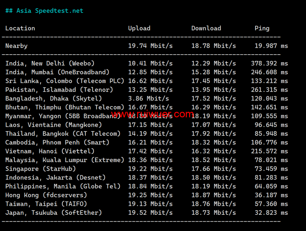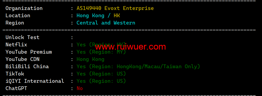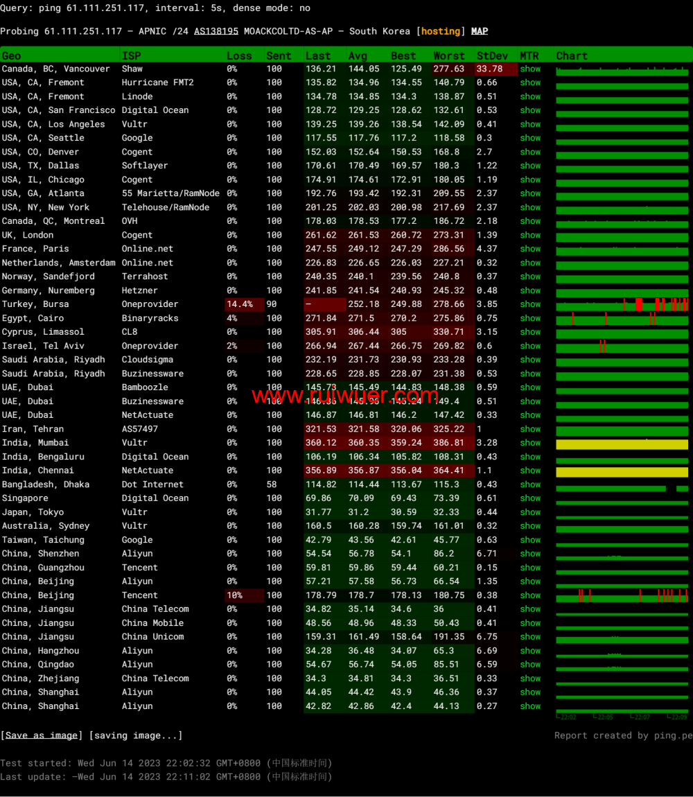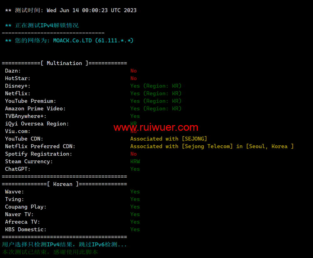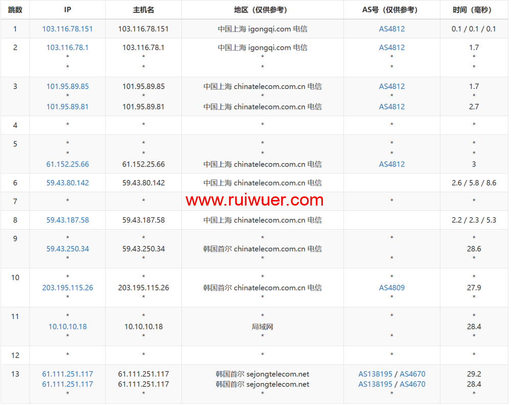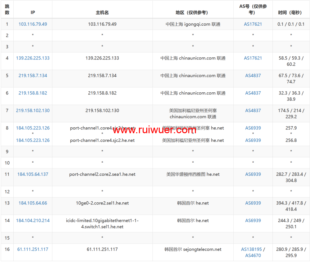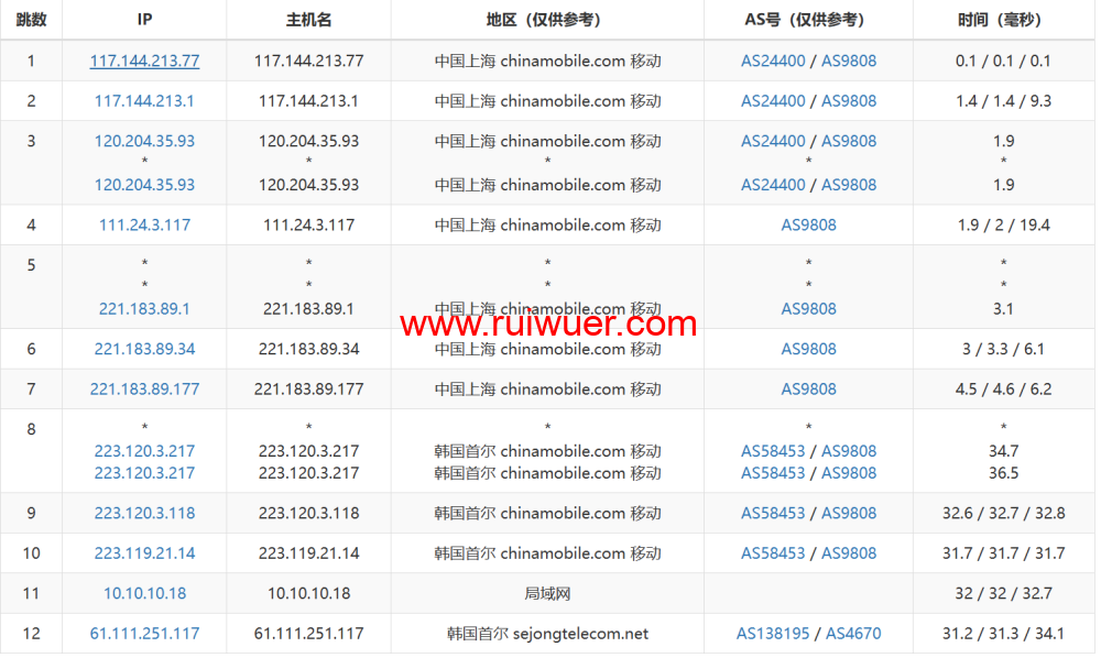 START -------------------- Round 1 - SuperTrace 路由到 - 北京电信 -------------------- traceroute to 106.37.68.26 (106.37.68.26), 30 hops max, 32 byte packets 1 10.0.1.1 0.12 ms * LAN Address 2 61.111.129.1 0.61 ms AS138195 Republic of Korea, Seoul, sejongtelecom.net 3 10.10.10.17 0.28 ms * LAN Address 4 203.195.115.25 1.69 ms AS4809 Republic of Korea, Seoul, ChinaTelecom 5 59.43.247.41 53.23 ms * China, Shanghai, ChinaTelecom 6 59.43.247.101 76.09 ms * China, Beijing, ChinaTelecom 7 * 8 59.43.131.253 61.42 ms * China, Beijing, ChinaTelecom 9 202.97.42.13 76.45 ms AS4134 China, Beijing, ChinaTelecom 10 36.112.241.66 77.98 ms AS4847 China, Beijing, ChinaTelecom 11 bj141-162-214.bjtelecom.net (219.141.162.214) 79.03 ms AS4847 China, Beijing, ChinaTelecom 12 bj141-160-38.bjtelecom.net (219.141.160.38) 64.15 ms AS4847 China, Beijing, ChinaTelecom 13 * 14 26.68.37.106.static.bjtelecom.net (106.37.68.26) 63.72 ms AS4847 China, Beijing, ChinaTelecom -------------------- Round 2 - SuperTrace 路由到 - 北京联通 -------------------- traceroute to 202.96.18.1 (202.96.18.1), 30 hops max, 32 byte packets 1 10.0.1.1 0.11 ms * LAN Address 2 61.111.129.1 0.62 ms AS138195 Republic of Korea, Seoul, sejongtelecom.net 3 10.10.10.17 0.37 ms * LAN Address 4 * 5 1.213.152.57 48.16 ms AS3786 Republic of Korea, Seoul, uplus.co.kr 6 1.208.106.90 37.79 ms AS3786 Republic of Korea, Seoul, uplus.co.kr 7 211.40.6.210 141.35 ms AS3786 China, Shanghai, uplus.co.kr 8 219.158.113.126 213.70 ms AS4837 China, Shanghai, ChinaUnicom 9 * 10 219.158.16.85 236.93 ms AS4837 China, Beijing, ChinaUnicom 11 * 12 61.148.159.18 161.82 ms AS4808 China, Beijing, ChinaUnicom 13 61.148.74.222 160.17 ms AS4808 China, Beijing, ChinaUnicom 14 202.106.86.4 168.42 ms AS4808 China, Beijing, ChinaUnicom 15 * 16 * 17 202.96.18.1 177.46 ms AS4808 China, Beijing, ChinaUnicom -------------------- Round 3 - SuperTrace 路由到 - 北京移动 -------------------- traceroute to 211.136.66.129 (211.136.66.129), 30 hops max, 32 byte packets 1 10.0.1.1 0.14 ms * LAN Address 2 61.111.129.1 0.64 ms AS138195 Republic of Korea, Seoul, sejongtelecom.net 3 10.10.10.17 0.27 ms * LAN Address 4 223.119.21.13 2.00 ms AS58453 Republic of Korea, Seoul, ChinaMobile 5 223.120.3.117 1.68 ms AS58453 Republic of Korea, Seoul, ChinaMobile 6 223.120.3.98 36.84 ms AS58453 China, Hong Kong, ChinaMobile 7 223.120.22.142 77.38 ms AS58453 China, Beijing, ChinaMobile 8 221.183.55.106 78.10 ms AS9808 China, Beijing, ChinaMobile 9 * 10 221.183.89.102 61.77 ms AS9808 China, Beijing, ChinaMobile 11 221.183.39.110 63.62 ms AS9808 China, Beijing, ChinaMobile 12 221.179.171.21 63.10 ms AS56048 China, Beijing, ChinaMobile 13 211.136.66.129 62.86 ms AS56048 China, Beijing, ChinaMobile -------------------- Round 4 - SuperTrace 路由到 - 北京教育 -------------------- traceroute to 210.31.160.77 (210.31.160.77), 30 hops max, 32 byte packets 1 10.0.1.1 0.10 ms * LAN Address 2 61.111.129.1 0.94 ms AS138195 Republic of Korea, Seoul, sejongtelecom.net 3 10.10.10.17 0.60 ms * LAN Address 4 * 5 10ge0-91.core3.tyo1.he.net (184.105.64.65) 31.94 ms AS6939 Japan, Tokyo, he.net 6 * 7 erx-cernet-bkb-as4538.10gigabitethernet3-2.core1.lax2.he.net (216.218.244.106) 137.89 ms AS6939 United States, California, Los Angeles, he.net 8 101.4.117.185 187.95 ms AS4538 United States, California, Los Angeles, CHINAEDU 9 101.4.117.213 188.86 ms AS4538 China, Beijing, CHINAEDU 10 * 11 * 12 101.4.117.81 186.28 ms AS4538 China, Beijing, CHINAEDU 13 101.4.116.94 186.84 ms AS4538 China, Beijing, CHINAEDU 14 101.4.117.134 186.40 ms AS4538 China, Beijing, CHINAEDU 15 202.112.41.134 631.19 ms AS4538 China, Beijing, CHINAEDU 16 210.31.160.77 185.31 ms AS4538 China, Beijing, CHINAEDU -------------------- Round 5 - SuperTrace 路由到 - 上海电信 -------------------- traceroute to 101.95.89.90 (101.95.89.90), 30 hops max, 32 byte packets 1 10.0.1.1 0.13 ms * LAN Address 2 61.111.129.1 0.69 ms AS138195 Republic of Korea, Seoul, sejongtelecom.net 3 10.10.10.17 0.25 ms * LAN Address 4 203.195.115.25 1.53 ms AS4809 Republic of Korea, Seoul, ChinaTelecom 5 59.43.187.209 38.29 ms * China, Shanghai, ChinaTelecom 6 * 7 59.43.130.213 29.25 ms * China, Shanghai, ChinaTelecom 8 101.95.88.34 24.61 ms AS4812 China, Shanghai, ChinaTelecom 9 101.95.89.90 39.00 ms AS4812 China, Shanghai, ChinaTelecom -------------------- Round 6 - SuperTrace 路由到 - 上海联通 -------------------- traceroute to 219.158.111.253 (219.158.111.253), 30 hops max, 32 byte packets 1 10.0.1.1 0.10 ms * LAN Address 2 61.111.129.1 5.93 ms AS138195 Republic of Korea, Seoul, sejongtelecom.net 3 10.10.10.17 0.60 ms * LAN Address 4 211.53.96.21 58.05 ms AS3786 Republic of Korea, Seoul, uplus.co.kr 5 1.208.167.33 59.07 ms AS3786 Republic of Korea, Seoul, uplus.co.kr 6 1.208.178.82 37.45 ms AS3786 Republic of Korea, Seoul, uplus.co.kr 7 211.40.6.210 190.87 ms AS3786 China, Shanghai, uplus.co.kr 8 219.158.19.86 149.97 ms AS4837 China, Shanghai, ChinaUnicom 9 219.158.111.253 149.94 ms AS4837 China, Shanghai, ChinaUnicom -------------------- Round 7 - SuperTrace 路由到 - 上海移动 -------------------- traceroute to 221.183.89.46 (221.183.89.46), 30 hops max, 32 byte packets 1 10.0.1.1 0.11 ms * LAN Address 2 61.111.129.1 0.89 ms AS138195 Republic of Korea, Seoul, sejongtelecom.net 3 10.10.10.17 2.95 ms * LAN Address 4 223.119.21.13 1.84 ms AS58453 Republic of Korea, Seoul, ChinaMobile 5 223.120.3.113 13.75 ms AS58453 Republic of Korea, Seoul, ChinaMobile 6 223.120.3.210 26.67 ms AS58453 China, Shanghai, ChinaMobile 7 221.183.89.174 28.55 ms AS9808 China, Shanghai, ChinaMobile 8 * 9 221.183.89.46 30.48 ms AS9808 China, Shanghai, ChinaMobile -------------------- Round 8 - SuperTrace 路由到 - 上海教育 -------------------- traceroute to 202.112.27.18 (202.112.27.18), 30 hops max, 32 byte packets 1 10.0.1.1 0.11 ms * LAN Address 2 61.111.129.1 0.70 ms AS138195 Republic of Korea, Seoul, sejongtelecom.net 3 10.10.10.17 0.32 ms * LAN Address 4