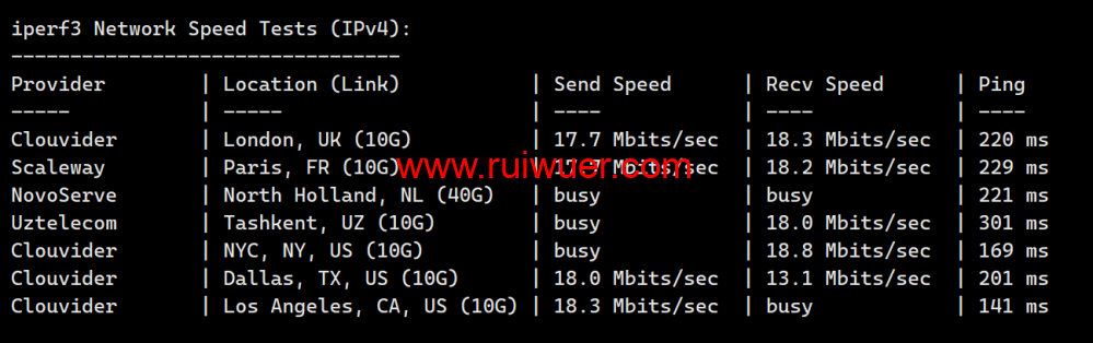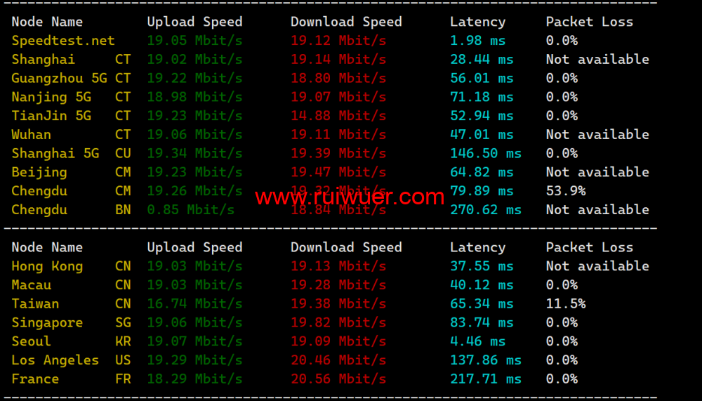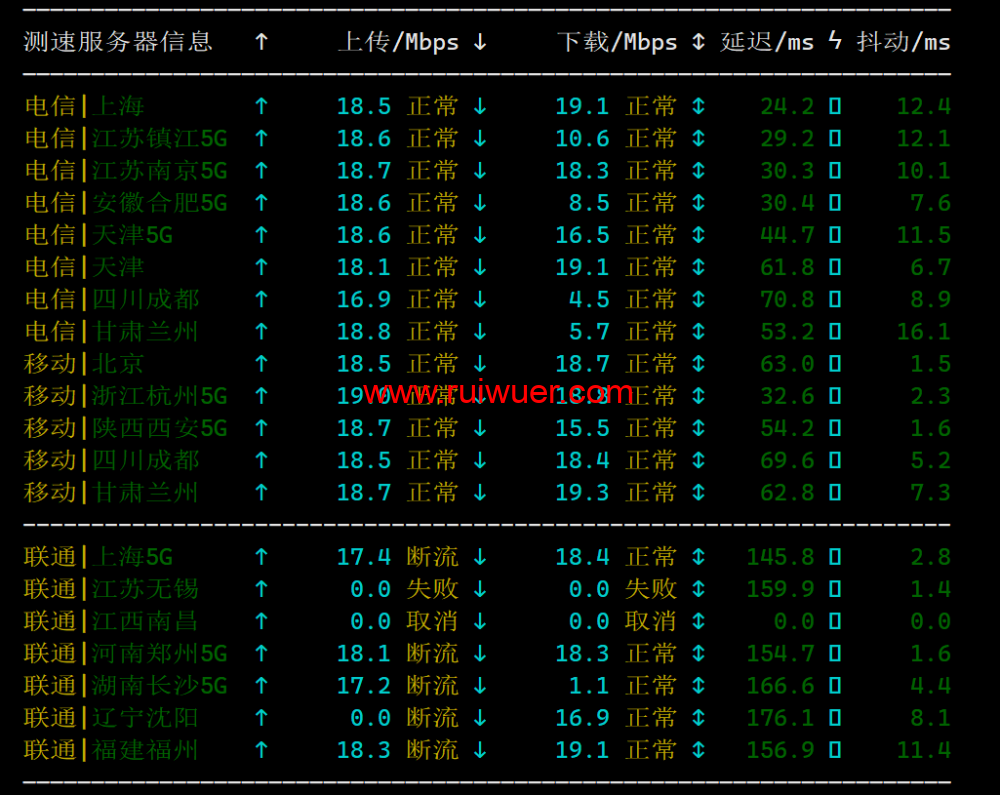 2023/06/14 13:59:55 正在测试三网回程路由... 2023/06/14 13:59:56 北京电信 219.141.136.12 电信CN2 [优质线路] 2023/06/14 13:59:56 北京联通 202.106.50.1 联通4837[普通线路] 2023/06/14 13:59:56 北京移动 221.179.155.161 移动CMI [普通线路] 2023/06/14 13:59:56 上海电信 202.96.209.133 电信CN2 [优质线路] 2023/06/14 13:59:56 上海联通 210.22.97.1 联通4837[普通线路] 2023/06/14 13:59:56 上海移动 211.136.112.200 移动CMI [普通线路] 2023/06/14 13:59:56 广州电信 58.60.188.222 电信CN2 [优质线路] 2023/06/14 13:59:56 广州联通 210.21.196.6 联通4837[普通线路] 2023/06/14 13:59:56 广州移动 120.196.165.24 移动CMI [普通线路] 2023/06/14 13:59:56 成都电信 61.139.2.69 电信CN2 [优质线路] 2023/06/14 13:59:56 成都联通 119.6.6.6 联通4837[普通线路] 2023/06/14 13:59:56 成都移动 211.137.96.205 移动CMI [普通线路]