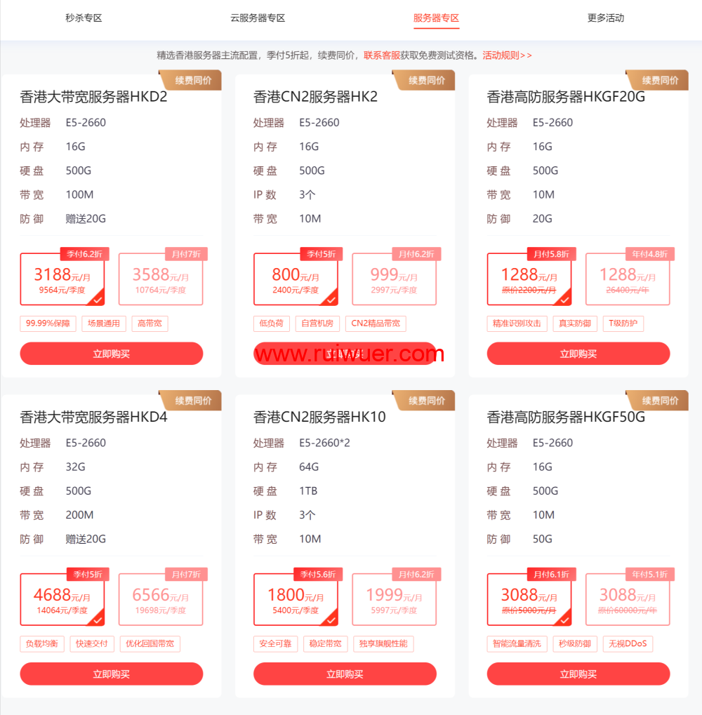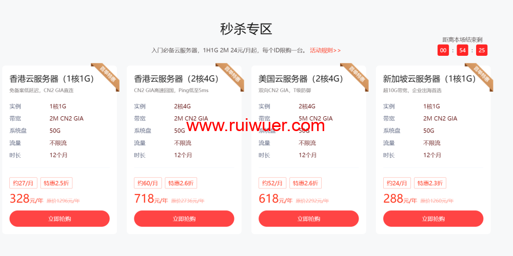 华纳云会在特定时间推出限时秒杀活动,用户可以在规定时间内购买到价格极低的服务器实例。比如1H1G云主机低至2.3折,24元/月,288/年。→点击这里