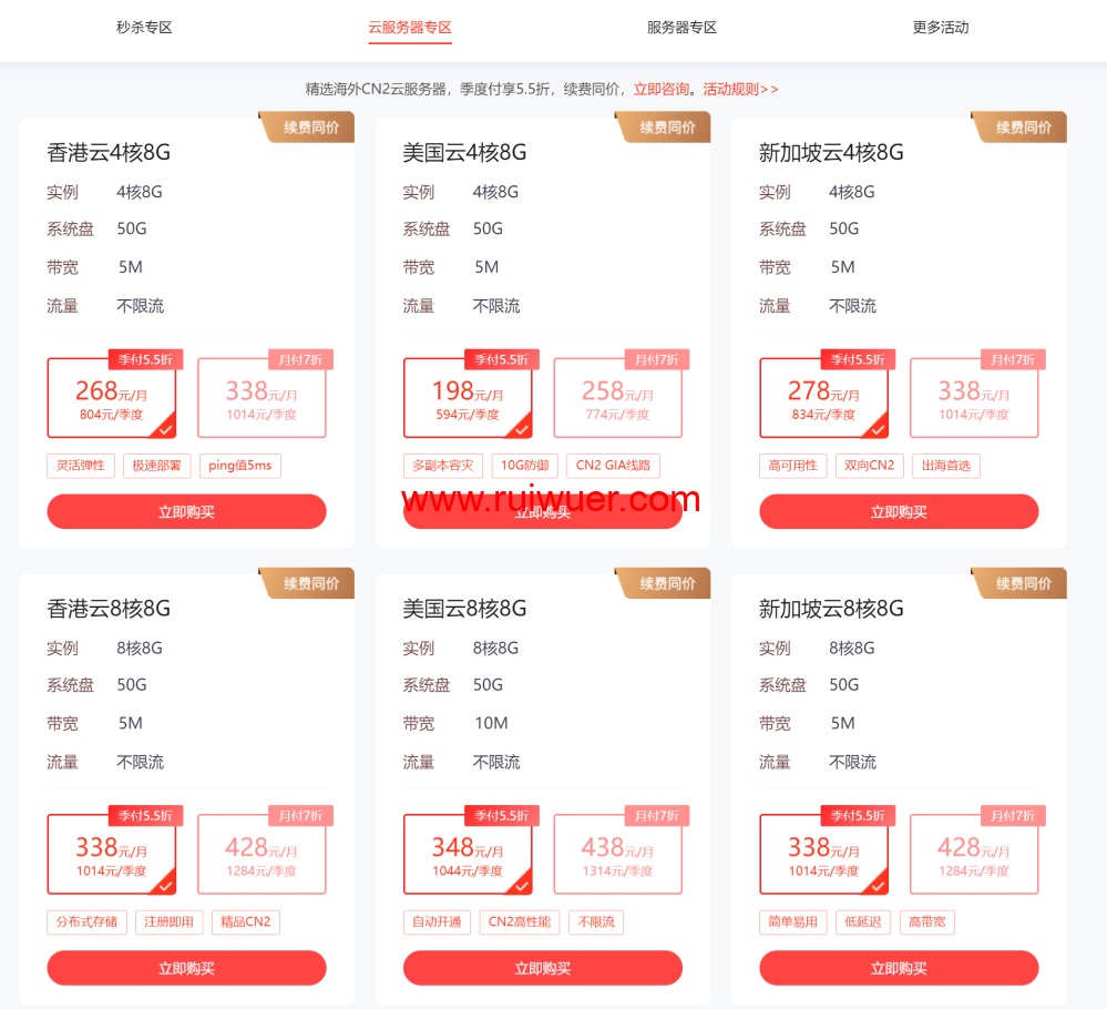 目前华纳云官网最新的优惠活动,服务器全场2.3折起,2H4G5M云服务器限时秒杀52元/月,618元/年,价格还是不错的,除此之外还有几款云服务器参与秒杀,感兴趣的小伙伴可以围观。