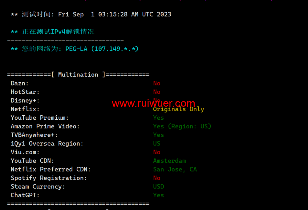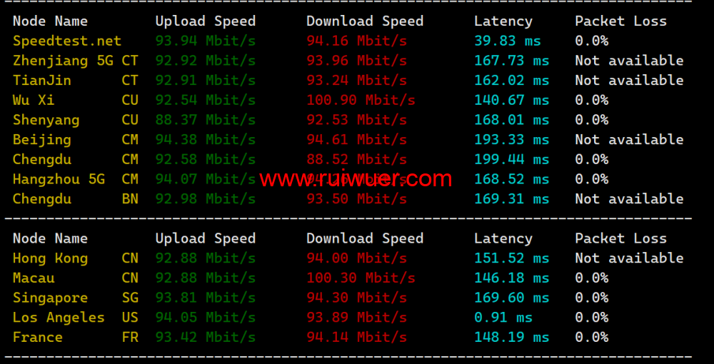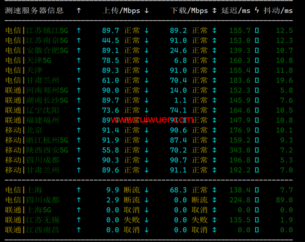 2023/09/06 02:46:25 正在测试三网回程路由... 2023/09/06 02:46:26 北京电信 219.141.136.12 联通9929[优质线路] 2023/09/06 02:46:26 北京联通 202.106.50.1 联通9929[优质线路] 2023/09/06 02:46:26 北京移动 221.179.155.161 联通9929[优质线路] 2023/09/06 02:46:26 上海电信 202.96.209.133 联通9929[优质线路] 2023/09/06 02:46:26 上海联通 210.22.97.1 联通9929[优质线路] 2023/09/06 02:46:26 上海移动 211.136.112.200 联通9929[优质线路] 2023/09/06 02:46:26 广州电信 58.60.188.222 联通9929[优质线路] 2023/09/06 02:46:26 广州联通 210.21.196.6 联通9929[优质线路] 2023/09/06 02:46:26 广州移动 120.196.165.24 联通9929[优质线路] 2023/09/06 02:46:26 成都电信 61.139.2.69 联通9929[优质线路] 2023/09/06 02:46:26 成都联通 119.6.6.6 联通9929[优质线路] 2023/09/06 02:46:26 成都移动 211.137.96.205 联通9929[优质线路] 2023/09/06 02:46:26 湖南电信 36.111.200.100 联通9929[优质线路] 2023/09/06 02:46:26 湖南联通 42.48.16.100 联通9929[优质线路] 2023/09/06 02:46:26 湖南移动 39.134.254.6 联通9929[优质线路]