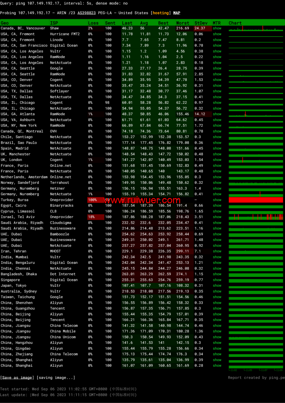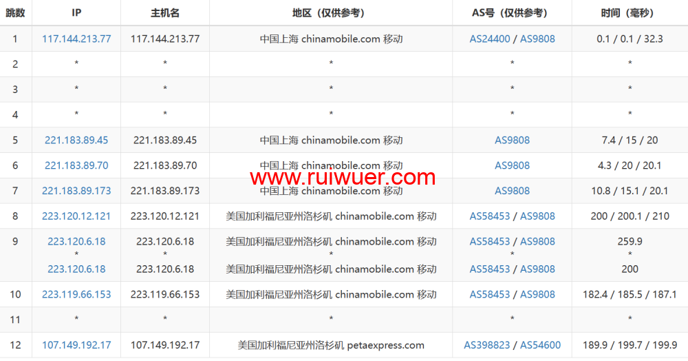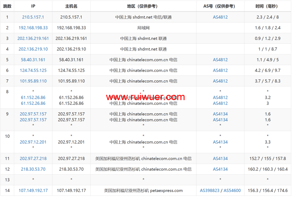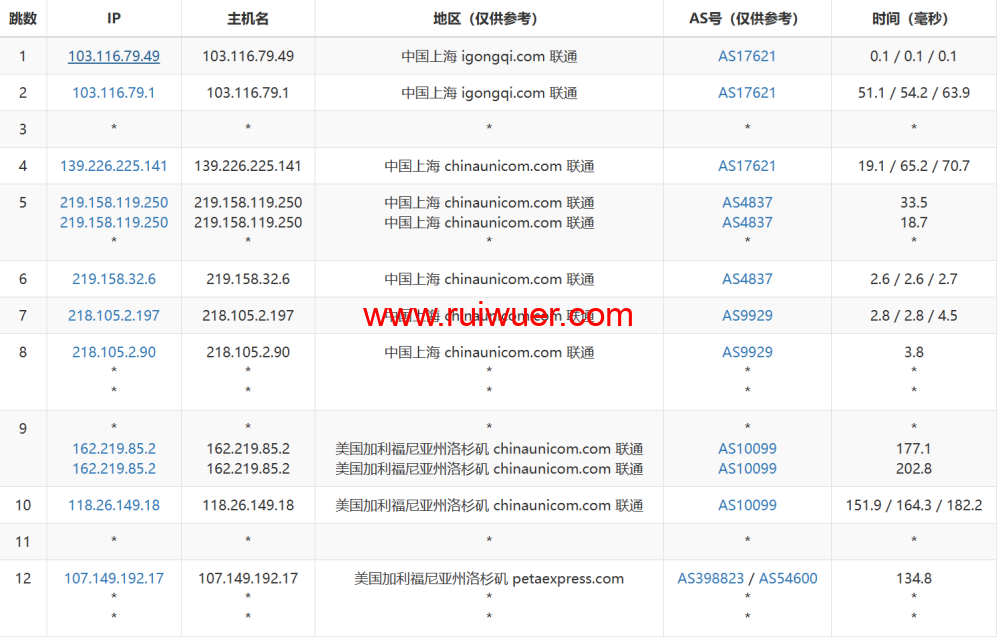广州电信 58.60.188.222 0.80 ms AS398823 [PT-82] 美国 加利福尼亚州 洛杉矶 petaexpress.com 1.04 ms * [RFC1918] 局域网 1.09 ms AS10099 [CUG-BACKBONE] 美国 加利福尼亚州 洛杉矶 chinaunicomglobal.com 129.20 ms AS10099 [CUG-BACKBONE] 中国 上海市 chinaunicomglobal.com 联通 129.54 ms AS9929 [CNC-BACKBONE] 中国 上海市 chinaunicom.cn 联通 CUII 154.99 ms AS9929 [CNC-BACKBONE] 中国 广东省 广州市 chinaunicom.cn 联通 CUII 159.63 ms * [APNIC-AP] 中国 广东省 广州市 264.31 ms AS4134 [CHINANET-BB] 中国 广东省 广州市 chinatelecom.com.cn 电信 159.74 ms AS134774 [CHINANET-GD] 中国 广东省 深圳市 chinatelecom.cn 电信 159.40 ms AS4134 中国 广东省 深圳市 福田区 chinatelecom.com.cn 电信 广州联通 210.21.196.6 1.00 ms AS398823 [PT-82] 美国 加利福尼亚州 洛杉矶 petaexpress.com 0.89 ms * [RFC1918] 局域网 1.09 ms AS10099 [CUG-BACKBONE] 美国 加利福尼亚州 洛杉矶 chinaunicomglobal.com 128.82 ms AS10099 [CUG-BACKBONE] 中国 上海市 chinaunicomglobal.com 联通 129.48 ms AS9929 [CNC-BACKBONE] 中国 上海市 chinaunicom.cn 联通 CUII 155.25 ms AS9929 [CNC-BACKBONE] 中国 广东省 广州市 chinaunicom.cn 联通 CUII 159.78 ms * [APNIC-AP] 中国 广东省 广州市 157.98 ms AS4837 [CU169-BACKBONE] 中国 广东省 广州市 chinaunicom.cn 联通 157.43 ms AS4837 [CU169-BACKBONE] 中国 广东省 广州市 chinaunicom.cn 联通 162.71 ms AS17816 [APNIC-AP] 中国 广东省 深圳市 chinaunicom.cn 联通 171.99 ms AS17623 [APNIC-AP] 中国 广东省 深圳市 chinaunicom.cn 联通 159.92 ms AS17623 [APNIC-AP] 中国 广东省 深圳市 宝安区 chinaunicom.cn 联通 广州移动 120.196.165.24 1.06 ms AS398823 [PT-82] 美国 加利福尼亚州 洛杉矶 petaexpress.com 0.86 ms * [RFC1918] 局域网 1.14 ms AS10099 [CUG-BACKBONE] 美国 加利福尼亚州 洛杉矶 chinaunicomglobal.com 128.74 ms AS10099 [CUG-BACKBONE] 中国 上海市 chinaunicomglobal.com 联通 132.73 ms AS9929 [CNC-BACKBONE] 中国 上海市 chinaunicom.cn 联通 CUII 156.11 ms AS9929 [CNC-BACKBONE] 中国 广东省 广州市 chinaunicom.cn 联通 CUII 156.33 ms * [APNIC-AP] 中国 广东省 广州市 162.30 ms AS4837 [CU169-BACKBONE] 中国 广东省 广州市 chinaunicom.cn 联通 150.80 ms AS9808 [CMNET] 中国 广东省 广州市 chinamobile.com 移动 159.52 ms AS9808 [CMNET] 中国 广东省 广州市 chinamobile.com 移动 155.27 ms AS9808 [CMNET] 中国 海南省 海口市 chinamobile.com 移动 160.23 ms AS56040 [APNIC-AP] 中国 广东省 深圳市 chinamobile.com 移动 ------------------------------------------------------------------------ 上海电信 202.96.209.133 2.60 ms AS398823 [PT-82] 美国 加利福尼亚州 洛杉矶 petaexpress.com 0.90 ms * [RFC1918] 局域网 1.04 ms AS10099 [CUG-BACKBONE] 美国 加利福尼亚州 洛杉矶 chinaunicomglobal.com 135.79 ms AS10099 [CUG-BACKBONE] 中国 上海市 chinaunicomglobal.com 联通 136.00 ms AS9929 [CNC-BACKBONE] 中国 上海市 chinaunicom.cn 联通 CUII 135.96 ms AS9929 [CNC-BACKBONE] 中国 上海市 chinaunicom.cn 联通 CUII 150.69 ms AS4134 [CHINANET-BB] 中国 上海市 chinatelecom.com.cn 电信 256.77 ms AS4134 [CHINANET-BB] 中国 上海市 chinatelecom.com.cn 电信 141.94 ms AS4812 [CHINANET-SH] 中国 上海市 闵行 chinatelecom.cn 147.42 ms AS4812 [CHINANET-SH] 中国 上海市 chinatelecom.cn 电信 上海联通 210.22.97.1 1.76 ms AS398823 [PT-82] 美国 加利福尼亚州 洛杉矶 petaexpress.com 0.93 ms * [RFC1918] 局域网 1.17 ms AS10099 [CUG-BACKBONE] 美国 加利福尼亚州 洛杉矶 chinaunicomglobal.com 135.39 ms AS10099 [CUG-BACKBONE] 中国 上海市 chinaunicomglobal.com 联通 136.04 ms AS9929 [CNC-BACKBONE] 中国 上海市 chinaunicom.cn 联通 CUII 136.00 ms AS9929 [CNC-BACKBONE] 中国 上海市 chinaunicom.cn 联通 CUII 144.30 ms AS4837 [CU169-BACKBONE] 中国 上海市 chinaunicom.cn 联通 137.06 ms AS17621 [APNIC-AP] 中国 上海市 chinaunicom.cn 联通 138.56 ms AS17621 [APNIC-AP] 中国 上海市 闵行区 chinaunicom.cn 联通 上海移动 211.136.112.200 0.83 ms AS398823 [PT-82] 美国 加利福尼亚州 洛杉矶 petaexpress.com 1.04 ms * [RFC1918] 局域网 1.14 ms AS10099 [CUG-BACKBONE] 美国 加利福尼亚州 洛杉矶 chinaunicomglobal.com 135.38 ms AS10099 [CUG-BACKBONE] 中国 上海市 chinaunicomglobal.com 联通 136.05 ms AS9929 [CNC-BACKBONE] 中国 上海市 chinaunicom.cn 联通 CUII 136.01 ms AS9929 [CNC-BACKBONE] 中国 上海市 chinaunicom.cn 联通 CUII 138.39 ms AS4837 [CU169-BACKBONE] 中国 上海市 chinaunicom.cn 联通 260.98 ms AS9808 [CMNET] 中国 上海市 chinamobile.com 移动 361.50 ms AS9808 [CMNET] 中国 上海市 chinamobile.com 移动 270.40 ms AS9808 [CMNET] 中国 上海市 chinamobile.com 移动 164.50 ms AS24400 [CMNET] 中国 上海市 chinamobile.com 移动 160.21 ms AS24400 [CMNET] 中国 上海市 chinamobile.com 移动 165.18 ms AS24400 [CMNET] 中国 上海市 浦东新区 chinamobile.com 移动 ------------------------------------------------------------------------ 北京电信 219.141.136.12 0.91 ms AS398823 [PT-82] 美国 加利福尼亚州 洛杉矶 petaexpress.com 1.02 ms * [RFC1918] 局域网 1.04 ms AS10099 [CUG-BACKBONE] 美国 加利福尼亚州 洛杉矶 chinaunicomglobal.com 129.15 ms AS10099 [CUG-BACKBONE] 中国 上海市 chinaunicomglobal.com 联通 129.36 ms AS9929 [CNC-BACKBONE] 中国 上海市 chinaunicom.cn 联通 CUII 250.93 ms AS9929 [CNC-BACKBONE] 中国 北京市 chinaunicom.cn 联通 CUII 154.31 ms * [CNC-BACKBONE] 中国 北京市 chinaunicom.cn 联通 CUII 152.08 ms AS4134 [CHINANET-BB] 中国 北京市 chinatelecom.com.cn 电信 354.57 ms AS4847 中国 北京市 chinatelecom.cn 171.45 ms AS4847 [CHINATELECOM-BJ] 中国 北京市 chinatelecom.cn 北京联通 202.106.50.1 2.03 ms AS398823 [PT-82] 美国 加利福尼亚州 洛杉矶 petaexpress.com 0.90 ms * [RFC1918] 局域网 1.00 ms AS10099 [CUG-BACKBONE] 美国 加利福尼亚州 洛