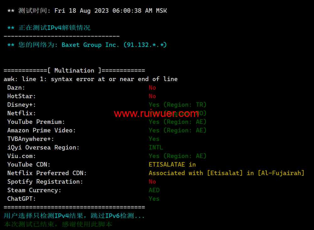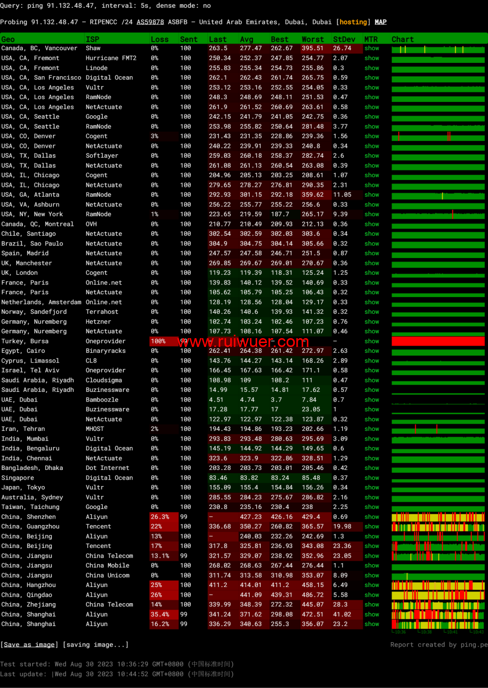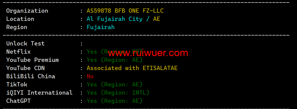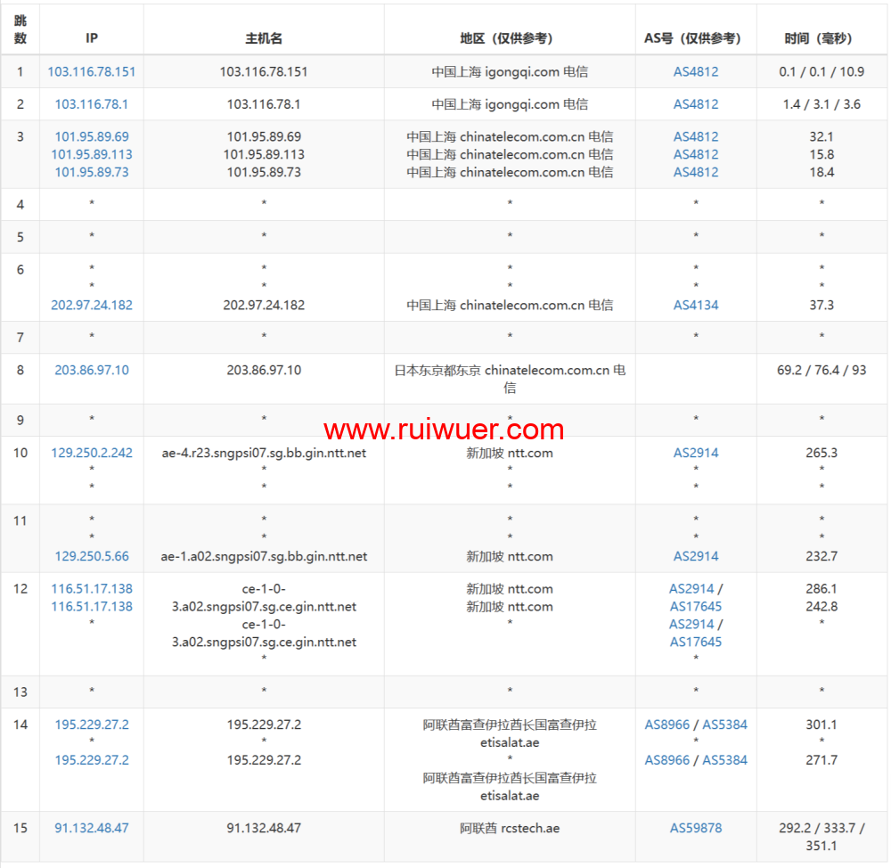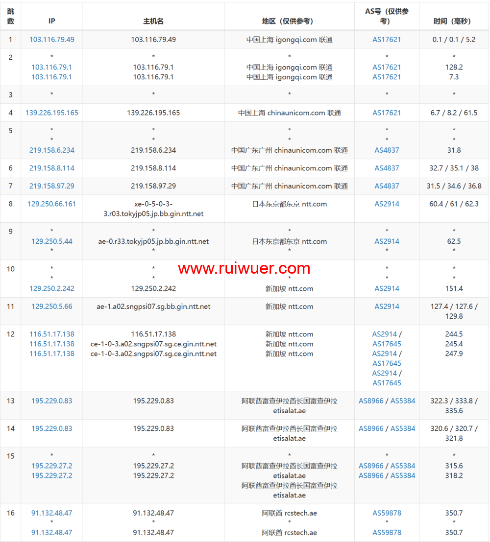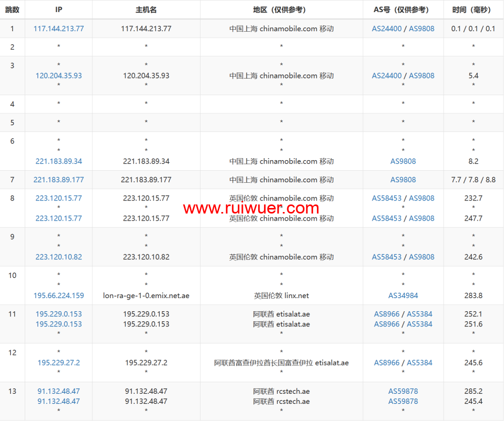 依次测试电信/联通/移动经过的地区及线路,核心程序来自ipip.net或nexttrace,请知悉! 广州电信 58.60.188.222 0.75 ms AS8849 阿联酋 富吉拉 melbicom.net 0.75 ms * RFC1918 1.82 ms AS8966 [AE-EMIRNET] 阿联酋 富吉拉 etisalat.ae 1.21 ms AS8966 [AE-EMIRNET] 阿联酋 迪拜酋长国 迪拜 etisalat.ae 116.23 ms AS3356 英国 英格兰 伦敦 level3.com 214.06 ms AS3356 [UK-LVLT] 英国 英格兰 伦敦 level3.com 446.25 ms AS4134 [CHINANET-BB] 中国 广东省 广州市 X-I chinatelecom.com.cn 电信 * ms AS4134 [CHINANET-BB] 中国 广东省 广州市 chinatelecom.com.cn 电信 349.33 ms AS4134 [CHINANET-BB] 中国 广东省 广州市 chinatelecom.com.cn 电信 474.80 ms AS134774 [CHINANET-GD] 中国 广东省 深圳市 chinatelecom.cn 电信 558.18 ms AS4134 中国 广东省 深圳市 福田区 chinatelecom.com.cn 电信 广州联通 210.21.196.6 0.51 ms AS8849 阿联酋 富吉拉 melbicom.net 0.60 ms * RFC1918 2.18 ms AS8966 [AE-EMIRNET] 阿联酋 富吉拉 etisalat.ae 269.44 ms AS8966 [AE-EMIRNET] 阿联酋 迪拜酋长国 迪拜 etisalat.ae 260.50 ms AS1239 [EQUINIX-IX] 美国 加利福尼亚州 洛杉矶 Equinix Los Angeles - Sprint - 10Gbps sprint.net 262.80 ms AS1239 [SPRINT-INNET9] 美国 加利福尼亚州 洛杉矶 sprint.net 307.70 ms AS1239 [SPRINT-INNET] 美国 加利福尼亚州 洛杉矶 sprint.net 316.00 ms AS4837 [CU169-BACKBONE] 中国 广东省 广州市 chinaunicom.cn 联通 323.16 ms AS4837 [CU169-BACKBONE] 中国 广东省 广州市 chinaunicom.cn 联通 339.79 ms AS17816 [UNICOM-GD] 中国 广东省 深圳市 chinaunicom.cn 联通 352.51 ms AS17623 [APNIC-AP] 中国 广东省 深圳市 chinaunicom.cn 联通 349.26 ms AS17623 [APNIC-AP] 中国 广东省 深圳市 宝安区 chinaunicom.cn 联通 广州移动 120.196.165.24 0.59 ms AS8849 阿联酋 富吉拉 melbicom.net 0.58 ms * RFC1918 1.58 ms AS8966 [AE-EMIRNET] 阿联酋 富吉拉 etisalat.ae 73.97 ms * RFC1918 284.56 ms AS58453 [CMI-INT] 新加坡 cmi.chinamobile.com 移动 253.06 ms AS58453 [CMI-INT] 中国 广东省 广州市 cmi.chinamobile.com 移动 252.23 ms AS9808 [CMNET] 中国 广东省 广州市 chinamobile.com 移动 252.37 ms AS9808 [CMNET] 中国 广东省 广州市 chinamobile.com 移动 217.54 ms AS9808 [CMNET] 中国 广东省 广州市 chinamobile.com 移动 254.31 ms AS9808 [CMNET] 中国 广东省 广州市 chinamobile.com 移动 220.01 ms AS9808 [CMNET] 中国 海南省 海口市 chinamobile.com 移动 255.52 ms AS56040 [APNIC-AP] 中国 广东省 深圳市 chinamobile.com 移动 ------------------------------------------------------------------------ 上海电信 202.96.209.133 0.54 ms AS8849 阿联酋 富吉拉 melbicom.net 0.84 ms * RFC1918 1.54 ms AS8966 [AE-EMIRNET] 阿联酋 富吉拉 etisalat.ae 1.16 ms AS8966 [AE-EMIRNET] 阿联酋 迪拜酋长国 迪拜 etisalat.ae 116.59 ms AS3356 英国 英格兰 伦敦 level3.com 212.81 ms AS3356 [UK-LVLT] 英国 英格兰 伦敦 level3.com 423.51 ms AS4134 [CHINANET-BB] 中国 上海市 X-I chinatelecom.com.cn 电信 342.57 ms AS4134 [CHINANET-BB] 中国 上海市 chinatelecom.com.cn 电信 329.87 ms AS4812 [CHINANET-SH] 中国 上海市 chinatelecom.cn 电信 343.35 ms AS4812 [CHINANET-SH] 中国 上海市 chinatelecom.cn 电信 上海联通 210.22.97.1 0.53 ms AS8849 阿联酋 富吉拉 melbicom.net 0.57 ms * RFC1918 3.08 ms AS8966 [AE-EMIRNET] 阿联酋 富吉拉 etisalat.ae 269.51 ms AS8966 [AE-EMIRNET] 阿联酋 迪拜酋长国 迪拜 etisalat.ae 262.83 ms AS1239 [EQUINIX-IX] 美国 加利福尼亚州 洛杉矶 Equinix Los Angeles - Sprint - 10Gbps sprint.net 261.14 ms AS1239 [SPRINT-INNET9] 美国 加利福尼亚州 洛杉矶 sprint.net 273.55 ms AS1239 [SPRINT-INNET9] 美国 加利福尼亚州 圣何塞 sprint.net 268.70 ms AS1239 [SPRINT-INNET9] 美国 加利福尼亚州 圣何塞 sprint.net 287.58 ms AS1239 [SPRINT-INNET] 美国 加利福尼亚州 帕洛阿尔托 / 圣何塞 sprint.net 330.99 ms AS4837 [CU169-BACKBONE] 中国 上海市 chinaunicom.cn 联通 286.55 ms AS4837 [CU169-BACKBONE] 中国 上海市 chinaunicom.cn 联通 * ms AS17621 [APNIC-AP] 中国 上海市 chinaunicom.cn 联通 377.77 ms AS17621 [APNIC-AP] 中国 上海市 闵行区 chinaunicom.cn 联通 上海移动 211.136.112.200 0.64 ms AS8849 阿联酋 富吉拉 melbicom.net 0.69 ms * RFC1918 3.55 ms AS8966 [AE-EMIRNET] 阿联酋 富吉拉 etisalat.ae 74.77 ms AS5384 [FALOIL-EMIRNET] 新加坡 Emirates Telecommunications Corporation 74.52 ms AS5384 [FALOIL-EMIRNET] 新加坡 Emirates Telecommunications Corporation 254.32 ms AS58453 [CMI-INT] 新加坡 cmi.chinamobile.com 移动 274.87 ms AS58453 [CMI-INT] 中国 上海市 cmi.chinamobile.com 移动 235.99 ms AS9808 [CMNET] 中国 上海市 chinamobile.com 移动 247.04 ms AS9808 [CMNET] 中国 上海市 chinamobile.com 移动 237.40 ms AS9808 [CMNET] 中国 上海市 chinamobile.com 移动 339.02 ms AS9808 [CMNET] 中国 上海市 chinamobile.com 移动 281.18 ms AS24400 [CMNET] 中国 上海市 chinamobile.com 移动 250.71 ms AS24400 [CMNET] 中国 上海市 chinamobile.com 移动 281.85 ms AS24400 [CMNET] 中国 上海市 浦东新区 chinamobile.com 移动 ------------------------------------------------------------------------ 北京电信 219.141.136.12 0.69 ms AS8849 阿联酋 富吉拉 melbicom.net 0.76 ms * RFC1918 1.12 ms AS8966 [AE-EMIRNET] 阿联酋 富吉拉 etisalat.ae 1.07 ms AS8966 [AE-EMIRNET] 阿联酋 迪拜酋长国 迪拜 etisalat.ae 115.84 ms AS3356 英国 英格兰 伦敦 level3.com 137.61 ms AS3356 [UK-LVLT] 英国 英格兰 伦敦 level3.com * ms AS4134 [CHINANET-BB] 中国 北京市 chinatelecom.com.cn 电信 324.03 ms AS4847 [CHINANET-GD] 中国 北京市 chinatelecom.cn * ms AS4847 [CHINATELECOM-BJ] 中国 北京市 chinatelecom.cn 北京联通 202.106.50.1 0.48 ms AS8849 阿联酋 富吉拉 melbicom.net 0.64 ms * RFC1918 3.12 ms AS8966 [AE-EMIRNET] 阿联酋 富吉拉 etisalat.ae 120.92 ms AS8966 [FALOIL-EMIRNET] 阿联酋 迪拜酋长国 迪拜 etisalat.ae 113