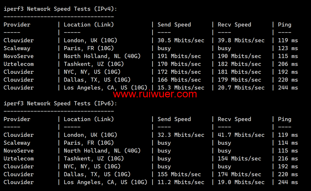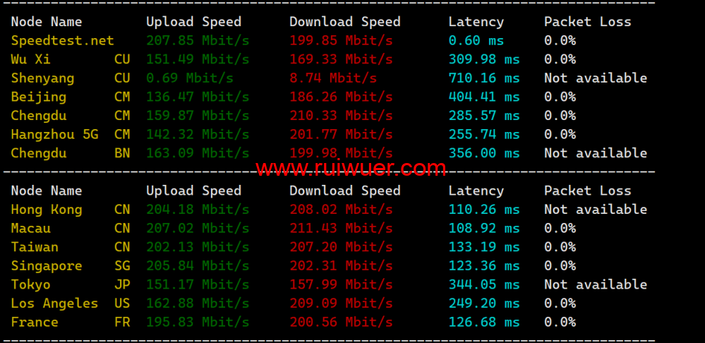 2023/08/30 05:41:44 正在测试三网回程路由... 2023/08/30 05:41:45 北京电信 219.141.136.12 电信163 [普通线路] 2023/08/30 05:41:45 北京联通 202.106.50.1 联通4837[普通线路] 2023/08/30 05:41:45 北京移动 221.179.155.161 移动CMI [普通线路] 2023/08/30 05:41:45 上海电信 202.96.209.133 电信163 [普通线路] 2023/08/30 05:41:45 上海联通 210.22.97.1 联通4837[普通线路] 2023/08/30 05:41:45 上海移动 211.136.112.200 移动CMI [普通线路] 2023/08/30 05:41:45 广州电信 58.60.188.222 电信163 [普通线路] 2023/08/30 05:41:45 广州联通 210.21.196.6 联通4837[普通线路] 2023/08/30 05:41:45 广州移动 120.196.165.24 移动CMI [普通线路] 2023/08/30 05:41:45 成都电信 61.139.2.69 电信163 [普通线路] 2023/08/30 05:41:45 成都联通 119.6.6.6 联通4837[普通线路] 2023/08/30 05:41:45 成都移动 211.137.96.205 移动CMI [普通线路] 2023/08/30 05:41:45 湖南电信 36.111.200.100 电信163 [普通线路] 2023/08/30 05:41:45 湖南联通 42.48.16.100 联通4837[普通线路] 2023/08/30 05:41:45 湖南移动 39.134.254.6 移动CMI [普通线路]