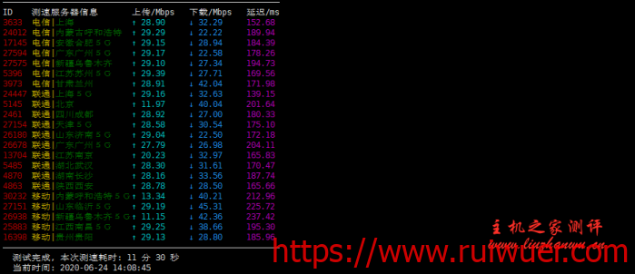 | 移动线路 | 11 | 广东广州(移动) 158.2 毫秒 | 江苏宿迁(UOVZ) 218.7 毫秒 | 189.5 毫秒 |