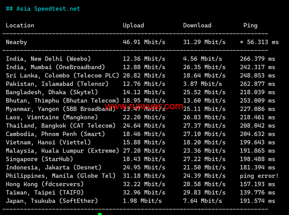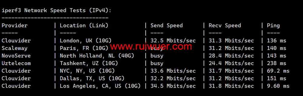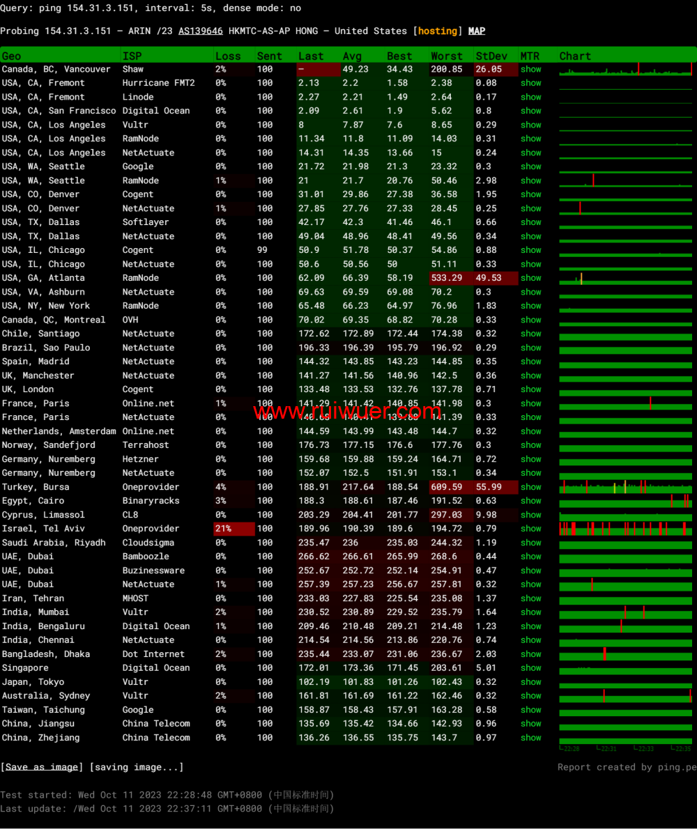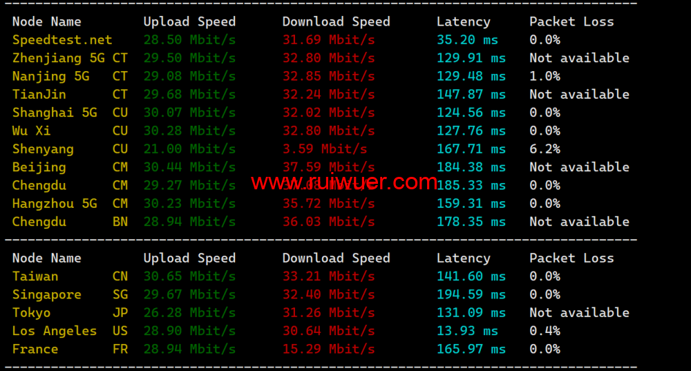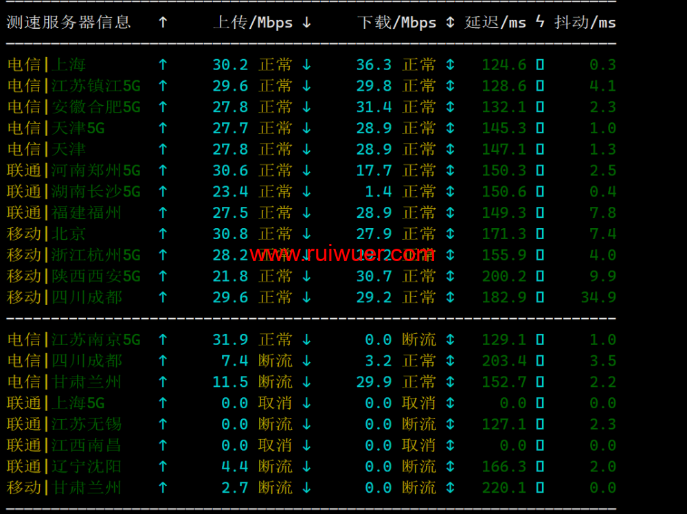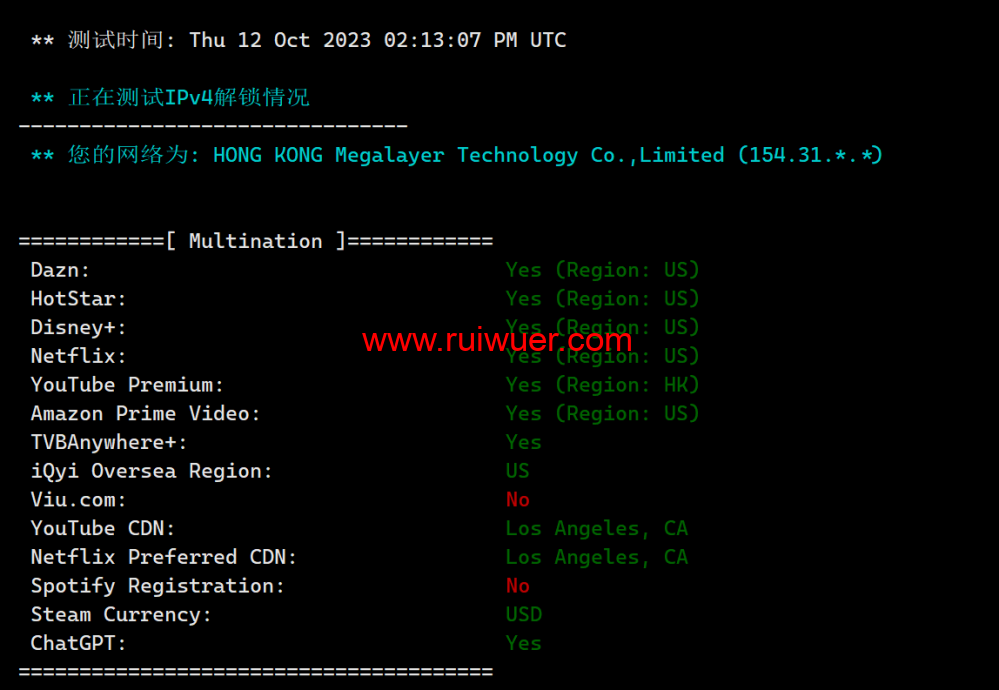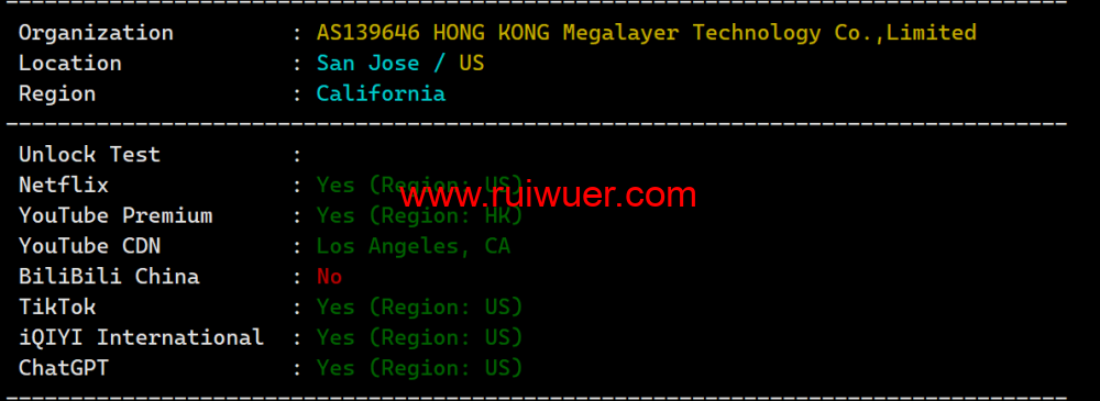2023/10/12 14:33:27 正在测试三网回程路由 国家: US 城市: San Jose 服务商: AS139646 HONG KONG Megalayer Technology Co.,Limited 项目地址: https://github.com/zhanghanyun/backtrace 北京电信 219.141.136.12 电信CN2 [优质线路] 北京联通 202.106.50.1 电信CN2 [优质线路] 北京移动 221.179.155.161 电信CN2 [优质线路] 上海电信 202.96.209.133 电信CN2 [优质线路] 上海联通 210.22.97.1 电信CN2 [优质线路] 上海移动 211.136.112.200 电信CN2 [优质线路] 广州电信 58.60.188.222 电信CN2 [优质线路] 广州联通 210.21.196.6 电信CN2 [优质线路] 广州移动 120.196.165.24 电信CN2 [优质线路] 成都电信 61.139.2.69 电信CN2 [优质线路] 成都联通 119.6.6.6 电信CN2 [优质线路] 成都移动 211.137.96.205 电信CN2 [优质线路] 2023/10/12 14:33:28 测试完成!