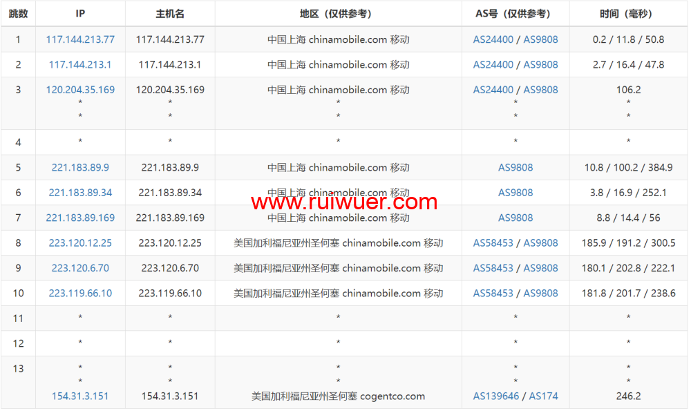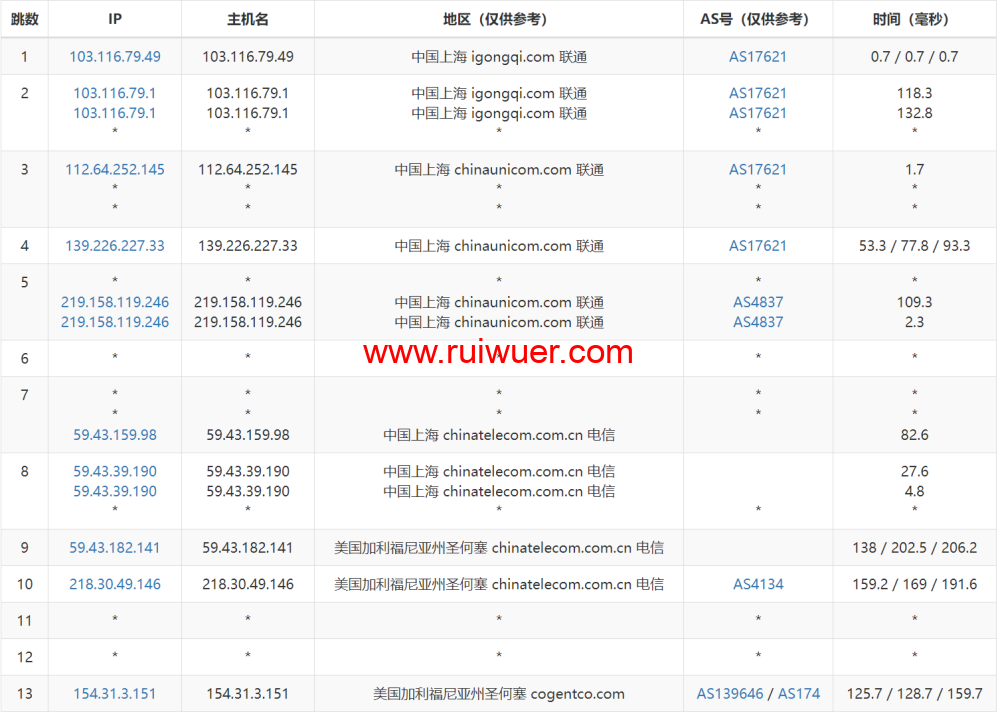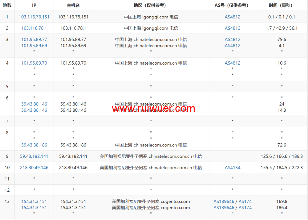 START -------------------- Round 1 - SuperTrace 路由到 - 北京电信 -------------------- traceroute to 106.37.68.26 (106.37.68.26), 30 hops max, 32 byte packets 1 38.59.124.252 0.99 ms AS139646 美国, 加利福尼亚州, 圣何塞, cogentco.com 2 10.60.214.2 0.46 ms * 局域网 3 218.30.49.145 1.50 ms AS4134 美国, 加利福尼亚州, 圣何塞, chinatelecom.com.cn, 电信 4 59.43.182.85 124.08 ms * 中国, 上海, chinatelecom.com.cn, 电信 5 * 6 59.43.130.205 125.93 ms * 中国, 上海, chinatelecom.com.cn, 电信 7 * 8 * 9 * 10 * 11 36.112.226.189 147.68 ms AS4847 中国, 北京, chinatelecom.com.cn, 电信 12 bj141-160-38.bjtelecom.net (219.141.160.38) 200.11 ms AS4847 中国, 北京, chinatelecom.com.cn, 电信 13 * 14 26.68.37.106.static.bjtelecom.net (106.37.68.26) 146.64 ms AS4847 中国, 北京, chinatelecom.com.cn, 电信 -------------------- Round 2 - SuperTrace 路由到 - 北京联通 -------------------- traceroute to 202.96.18.1 (202.96.18.1), 30 hops max, 32 byte packets 1 38.59.124.252 0.98 ms AS139646 美国, 加利福尼亚州, 圣何塞, cogentco.com 2 10.60.214.2 36.50 ms * 局域网 3 218.30.49.145 1.51 ms AS4134 美国, 加利福尼亚州, 圣何塞, chinatelecom.com.cn, 电信 4 59.43.182.85 123.55 ms * 中国, 上海, chinatelecom.com.cn, 电信 5 59.43.39.205 123.77 ms * 中国, 上海, chinatelecom.com.cn, 电信 6 59.43.159.97 124.32 ms * 中国, 上海, chinatelecom.com.cn, 电信 7 * 8 * 9 202.97.17.122 151.52 ms AS4134 中国, 北京, chinatelecom.com.cn, 电信 10 219.158.45.117 150.97 ms AS4837 中国, 北京, chinaunicom.com, 联通 11 219.158.3.1 147.55 ms AS4837 中国, 北京, chinaunicom.com, 联通 12 * 13 61.148.159.18 147.40 ms AS4808 中国, 北京, chinaunicom.com, 联通 14 61.148.74.222 147.49 ms AS4808 中国, 北京, chinaunicom.com, 联通 15 202.106.86.4 147.98 ms AS4808 中国, 北京, chinaunicom.com, 联通 16 * 17 * 18 202.96.18.1 147.46 ms AS4808 中国, 北京, chinaunicom.com, 联通 -------------------- Round 3 - SuperTrace 路由到 - 北京移动 -------------------- traceroute to 211.136.66.129 (211.136.66.129), 30 hops max, 32 byte packets 1 38.59.124.253 0.88 ms AS139646 美国, 加利福尼亚州, 圣何塞, cogentco.com 2 * 3 10.253.0.25 0.71 ms * 局域网 4 218.30.49.105 1.64 ms AS4134 美国, 加利福尼亚州, 圣何塞, chinatelecom.com.cn, 电信 5 59.43.182.182 123.38 ms * 中国, 上海, chinatelecom.com.cn, 电信 6 59.43.39.117 123.57 ms * 中国, 上海, chinatelecom.com.cn, 电信 7 59.43.159.17 124.64 ms * 中国, 上海, chinatelecom.com.cn, 电信 8 59.43.80.141 124.58 ms * 中国, 上海, chinatelecom.com.cn, 电信 9 * 10 * 11 221.183.128.141 178.71 ms AS9808 中国, 北京, chinamobile.com, 移动 12 * 13 211.136.66.129 180.29 ms AS56048 中国, 北京, chinamobile.com, 移动 -------------------- Round 4 - SuperTrace 路由到 - 北京教育 -------------------- traceroute to 210.31.160.77 (210.31.160.77), 30 hops max, 32 byte packets 1 38.59.124.253 0.87 ms AS139646 美国, 加利福尼亚州, 圣何塞, cogentco.com 2 10.60.214.14 0.70 ms * 局域网 3 63-219-22-25.static.pccwglobal.net (63.219.22.25) 1.47 ms AS3491,AS31713 美国, 加利福尼亚州, 圣何塞, pccw.com 4 * 5 tsingHua.hu0-0-0-9.clbr02.hkg04.pccwbtn.net (63.218.115.14) 185.15 ms AS3491,AS31713 中国, 香港, pccw.com 6 101.4.114.181 184.26 ms AS4538 中国, 北京, edu.cn, 教育网 7 * 8 101.4.117.81 183.57 ms AS4538 中国, 北京, edu.cn, 教育网 9 101.4.116.94 189.80 ms AS4538 中国, 北京, edu.cn, 教育网 10 101.4.117.134 186.73 ms AS4538 中国, 北京, edu.cn, 教育网 11 * 12 210.31.160.77 183.79 ms AS4538,AS24349 中国, 北京, 中国青年政治学院, edu.cn, 教育网 -------------------- Round 5 - SuperTrace 路由到 - 上海电信 -------------------- traceroute to 101.95.89.90 (101.95.89.90), 30 hops max, 32 byte packets 1 38.59.124.252 0.90 ms AS139646 美国, 加利福尼亚州, 圣何塞, cogentco.com 2 10.60.214.6 0.41 ms * 局域网 3 10.253.0.25 0.69 ms * 局域网 4 218.30.49.105 1.67 ms AS4134 美国, 加利福尼亚州, 圣何塞, chinatelecom.com.cn, 电信 5 * 6 59.43.181.33 134.26 ms * 中国, 上海, chinatelecom.com.cn, 电信 7 59.43.130.213 127.48 ms * 中国, 上海, chinatelecom.com.cn, 电信 8 101.95.88.174 125.08 ms AS4812 中国, 上海, chinatelecom.com.cn, 电信 9 101.95.89.90 123.91 ms AS4812 中国, 上海, chinatelecom.com.cn, 电信 -------------------- Round 6 - SuperTrace 路由到 - 上海联通 -------------------- traceroute to 219.158.111.253 (219.158.111.253), 30 hops max, 32 byte packets 1 38.59.124.252 0.96 ms AS139646 美国, 加利福尼亚州, 圣何塞, cogentco.com 2 10.60.214.6 0.42 ms * 局域网 3 10.253.0.25 0.60 ms * 局域网 4 218.30.49.105 1.55 ms AS4134 美国, 加利福尼亚州, 圣何塞, chinatelecom.com.cn, 电信 5 59.43.182.182 123.36 ms * 中国, 上海, chinatelecom.com.cn, 电信 6 59.43.39.193 123.64 ms * 中国, 上海, chinatelecom.com.cn, 电信 7 * 8 * 9 * 10 219.158.111.253 233.49 ms AS4837 中国, 上海, chinaunicom.com, 联通 -------------------- Round 7 - SuperTrace 路由到 - 上海移动 -------------------- traceroute to 221.183.89.46 (221.183.89.46), 30 hops max, 32 byte packets 1 38.59.124.252 0.83 ms AS139646 美国, 加利福尼亚州, 圣何塞, cogentco.com 2 10.60.214.6 0.48 ms * 局域网 3 10.253.0.25 0.50 ms * 局域网 4 218.30.49.105 1.81 ms AS4134 美国, 加利福尼亚州, 圣何塞, chinatelecom.com.cn, 电信 5 59.43.246.173 124.66 ms * 中国, 上海, chinatelecom.com.cn, 电信 6 59.43.39.125 124.06 ms * 中国, 上海, chinatelecom.com.cn, 电信 7 59.43.159.17 131.95 ms * 中国, 上海, chinatelecom.com.cn, 电信 8 59.43.80.141 128.77 ms * 中国, 上海, chinatelecom.com.cn, 电信 9 * 10 * 11 221.183.89.46 156.89 ms AS9808 中国, 上海, chinamobile.com, 移动 -------------------- Round 8 - SuperTrace 路由到 - 上海教育 -------------------- traceroute to 202.112.27.18 (202.112.27.18), 30 hops max