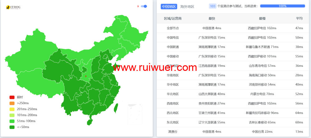 | 电信线路 | 87 | 广东广州(联通) 12.6 毫秒 | 贵州贵阳(移动-xf) 98.7 毫秒 | 47.6 毫秒 |