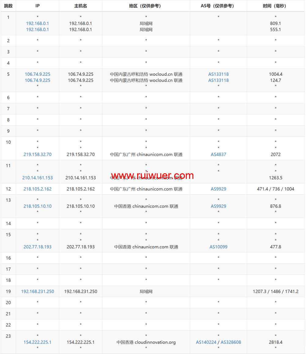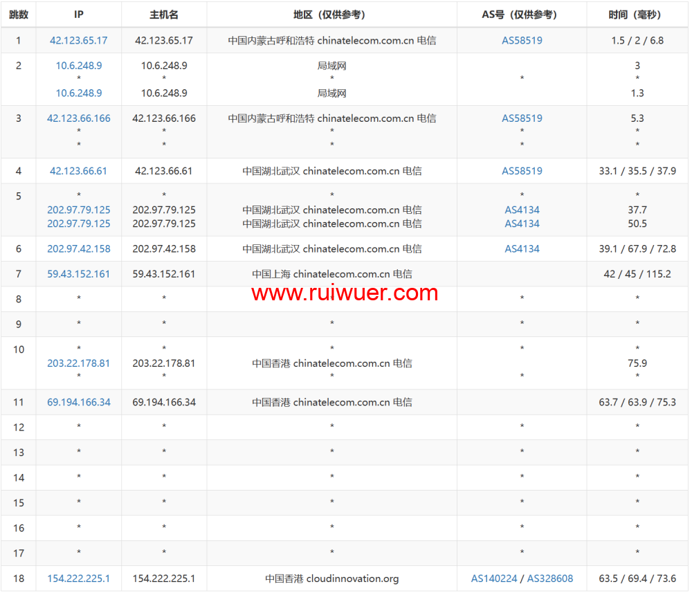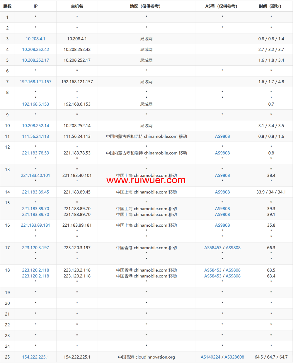 | 移动线路 | 33 | 广东广州(移动云) 13.5 毫秒 | 安徽合肥(移动-菠萝云) 2566.7 毫秒 | 123.5 毫秒 |