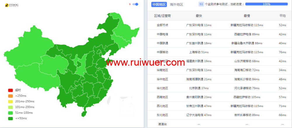 可以看到全国三网Ping的平均延迟在53ms左右,其中电信网络延迟在42ms左右,联通网络延迟在40ms左右,移动网络延迟在76ms左右。