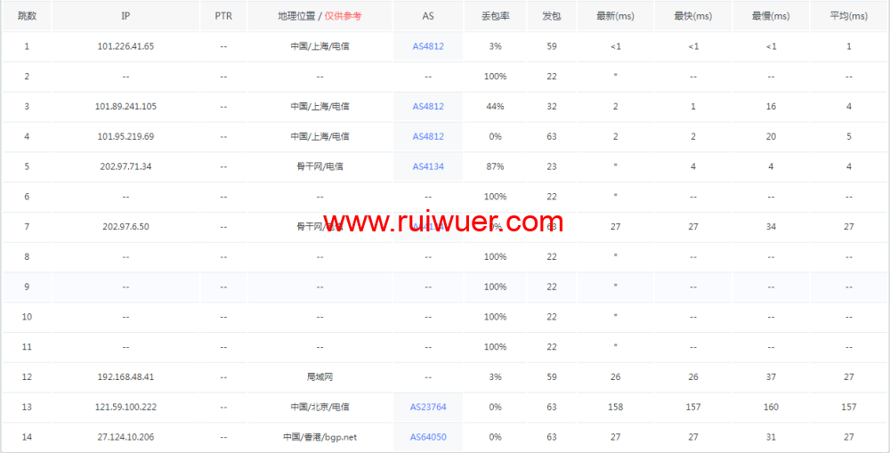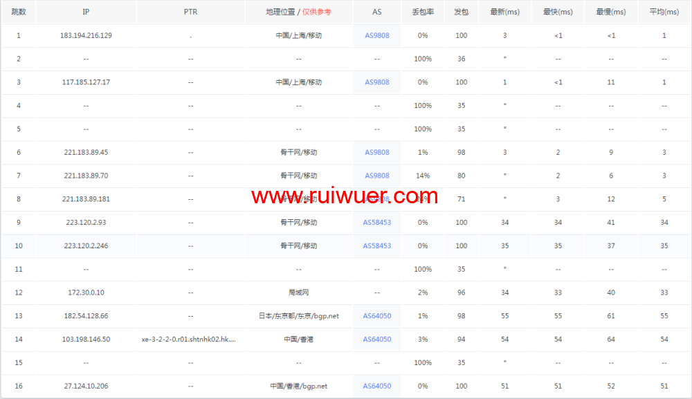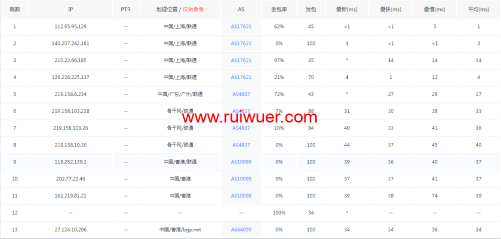 看完ping值检测后,下面我们再看看联通、移动、电信三网去程路由线路情况。
