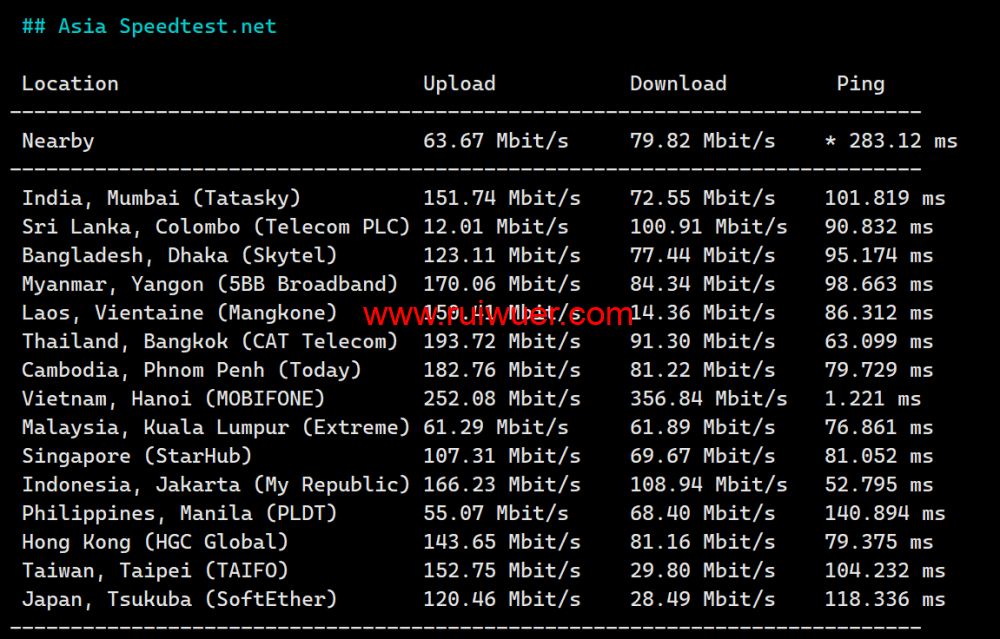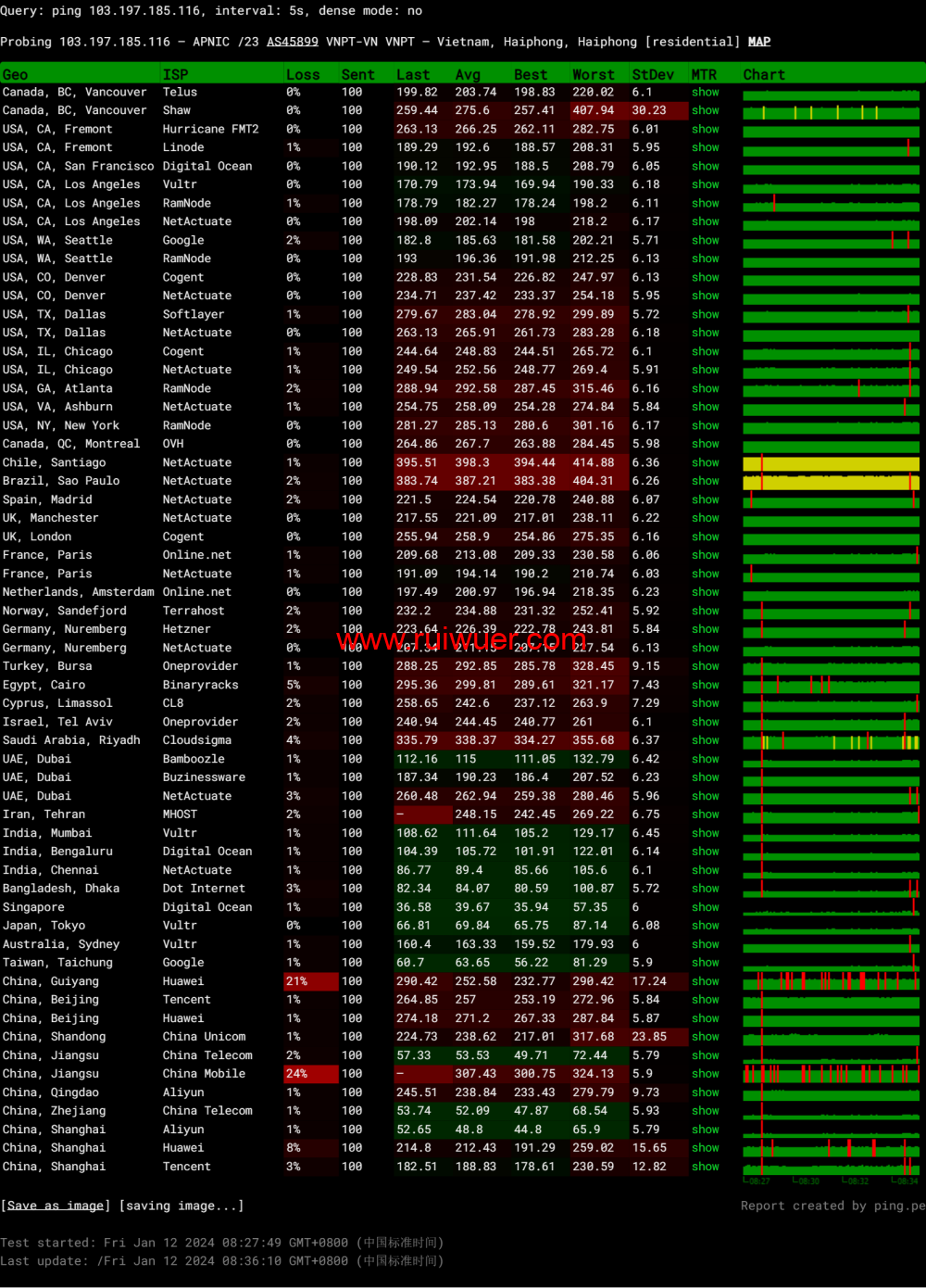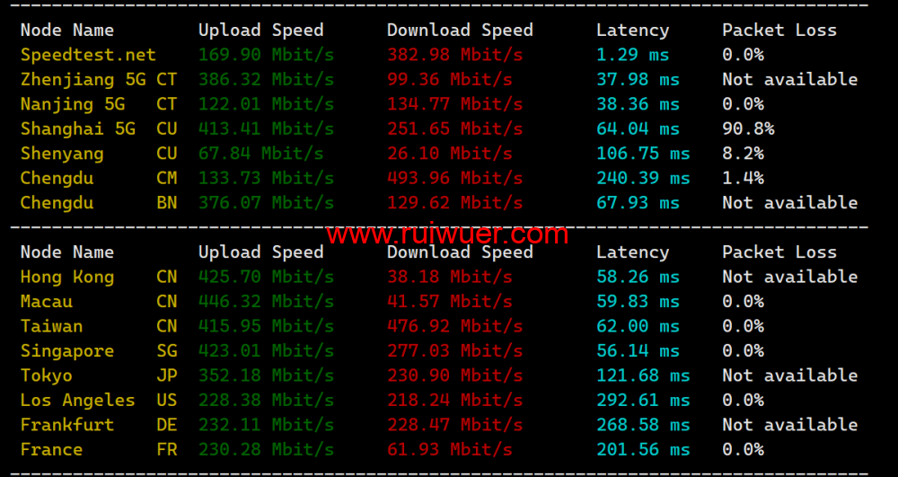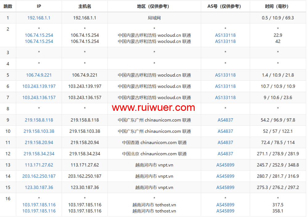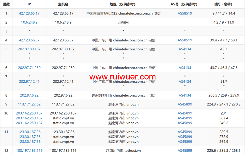 START -------------------- Round 1 - SuperTrace 路由到 - 北京电信 -------------------- traceroute to 106.37.68.26 (106.37.68.26), 30 hops max, 32 byte packets 1 103.197.185.254 0.63 ms AS45899 越南, 河内市, tothost.vn 2 static.vnpt.vn (123.30.187.33) 23.32 ms AS45899 越南, 河内市, vnpt.vn 3 static.vnpt.vn (203.162.250.186) 28.51 ms AS45899 越南, 河内市, vnpt.vn 4 static.vnpt.vn (113.171.27.33) 45.55 ms AS45899 越南, 河内市, vnpt.vn 5 * 6 static.vnpt.vn (113.171.35.119) 37.94 ms AS45899 中国, 香港, vnpt.vn 7 63-220-194-208.static.pccwglobal.net (63.220.194.208) 36.78 ms AS3491,AS31713 美国, pccw.com 8 * 9 HundredGE0-5-0-0.br03.lax05.pccwbtn.net (63.218.72.230) 205.13 ms AS3491,AS31713 美国, 加利福尼亚州, 洛杉矶, pccw.com 10 218.30.53.86 240.60 ms AS4134 美国, 加利福尼亚州, 洛杉矶, chinatelecom.com.cn, 电信 11 * 12 * 13 * 14 * 15 * 16 36.112.226.189 236.01 ms AS4847 中国, 北京, chinatelecom.com.cn, 电信 17 bj141-160-38.bjtelecom.net (219.141.160.38) 243.56 ms AS4847 中国, 北京, chinatelecom.com.cn, 电信 18 * 19 * 20 26.68.37.106.static.bjtelecom.net (106.37.68.26) 260.21 ms AS4847 中国, 北京, chinatelecom.com.cn, 电信 -------------------- Round 2 - SuperTrace 路由到 - 北京联通 -------------------- traceroute to 202.96.18.1 (202.96.18.1), 30 hops max, 32 byte packets 1 103.197.185.254 0.66 ms AS45899 越南, 河内市, tothost.vn 2 static.vnpt.vn (123.30.187.33) 21.61 ms AS45899 越南, 河内市, vnpt.vn 3 static.vnpt.vn (203.162.250.190) 17.75 ms AS45899 越南, 河内市, vnpt.vn 4 static.vnpt.vn (113.171.27.125) 39.70 ms AS45899 越南, 河内市, vnpt.vn 5 static.vnpt.vn (113.171.5.114) 21.19 ms AS45899 越南, 河内市, vnpt.vn 6 static.vnpt.vn (113.171.35.119) 34.19 ms AS45899 中国, 香港, vnpt.vn 7 63-220-194-208.static.pccwglobal.net (63.220.194.208) 17.78 ms AS3491,AS31713 美国, pccw.com 8 * 9 * 10 * 11 * 12 WS-CHINAUNICOM-HK-OPERATIONSLTD-C.customer.alter.net (157.130.246.202) 313.31 ms AS701 美国, 加利福尼亚州, 洛杉矶, verizon.com 13 219.158.16.97 369.61 ms AS4837 中国, 北京, chinaunicom.com, 联通 14 219.158.3.141 364.73 ms AS4837 中国, 北京, chinaunicom.com, 联通 15 * 16 * 17 61.148.159.18 365.45 ms AS4808 中国, 北京, chinaunicom.com, 联通 18 61.148.74.222 364.37 ms AS4808 中国, 北京, chinaunicom.com, 联通 19 202.106.86.4 357.41 ms AS4808 中国, 北京, chinaunicom.com, 联通 20 * 21 * 22 202.96.18.1 365.29 ms AS4808 中国, 北京, chinaunicom.com, 联通 -------------------- Round 3 - SuperTrace 路由到 - 北京移动 -------------------- traceroute to 211.136.66.129 (211.136.66.129), 30 hops max, 32 byte packets 1 103.197.185.254 0.67 ms AS45899 越南, 河内市, tothost.vn 2 static.vnpt.vn (123.30.187.33) 24.96 ms AS45899 越南, 河内市, vnpt.vn 3 static.vnpt.vn (203.162.250.190) 7.06 ms AS45899 越南, 河内市, vnpt.vn 4 * 5 static.vnpt.vn (113.171.16.93) 16.90 ms AS45899 越南, 河内市, vnpt.vn 6 static.vnpt.vn (113.171.35.119) 37.07 ms AS45899 中国, 香港, vnpt.vn 7 te0-0-0-30-0.sbr05.lax05.pccwbtn.net (63.218.212.5) 181.45 ms AS3491,AS31713 美国, 加利福尼亚州, 洛杉矶, pccw.com 8 lax-b22-link.ip.twelve99.net (213.248.97.138) 263.19 ms AS1299 美国, 加利福尼亚州, 洛杉矶, telia.com 9 chinamobile-ic-342123.ip.twelve99-cust.net (62.115.171.219) 196.32 ms AS1299 美国, 加利福尼亚州, 洛杉矶, telia.com 10 223.120.6.22 187.23 ms AS58453 美国, 加利福尼亚州, 洛杉矶, chinamobile.com, 移动 11 223.120.12.214 256.30 ms AS58453 中国, 上海, chinamobile.com, 移动 12 221.183.55.110 257.30 ms AS9808 中国, 北京, chinamobile.com, 移动 13 221.183.25.201 278.95 ms AS9808 中国, 北京, chinamobile.com, 移动 14 221.183.89.118 263.99 ms AS9808 中国, 北京, chinamobile.com, 移动 15 * 16 221.179.171.41 261.85 ms AS56048 中国, 北京, chinamobile.com, 移动 17 211.136.66.129 261.67 ms AS56048 中国, 北京, chinamobile.com, 移动 -------------------- Round 4 - SuperTrace 路由到 - 北京教育 -------------------- traceroute to 210.31.160.77 (210.31.160.77), 30 hops max, 32 byte packets 1 103.197.185.254 0.62 ms AS45899 越南, 河内市, tothost.vn 2 static.vnpt.vn (123.30.187.33) 17.67 ms AS45899 越南, 河内市, vnpt.vn 3 static.vnpt.vn (203.162.250.190) 35.44 ms AS45899 越南, 河内市, vnpt.vn 4 static.vnpt.vn (113.171.27.125) 71.42 ms AS45899 越南, 河内市, vnpt.vn 5 static.vnpt.vn (113.171.27.90) 74.41 ms AS45899 越南, 胡志明市, vnpt.vn 6 static.vnpt.vn (113.171.50.222) 62.83 ms AS45899 越南, 胡志明市, vnpt.vn 7 static.vnpt.vn (113.171.36.245) 65.58 ms AS45899 新加坡, vnpt.vn 8 121.59.128.49 63.70 ms * 亚太地区, chinatelecom.com.cn, 电信 9 CN.HKG.CTGNet (69.194.165.61) 117.88 ms * 中国, 香港, chinatelecom.com.cn, 电信 10 203.25.50.30 83.69 ms * 中国, 香港, chinatelecom.com.cn, 电信 11 * 12 202.97.83.21 106.11 ms AS4134 中国, 上海, chinatelecom.com.cn, 电信 13 * 14 202.97.68.98 111.80 ms AS4134 中国, 湖北, 武汉, chinatelecom.com.cn, 电信 15 * 16 * 17 101.4.117.125 103.61 ms AS4538 中国, 北京, edu.cn, 教育网 18 * 19 * 20 * 21 101.4.117.134 104.54 ms AS4538 中国, 北京, edu.cn, 教育网 22 * 23 210.31.160.77 122.91 ms AS4538,AS24349 中国, 北京, 中国青年政治学院, edu.cn, 教育网 -------------------- Round 5 - SuperTrace 路由到 - 上海电信 -------------------- traceroute to 101.95.89.90 (101.95.89.90), 30 hops max, 32 byte packets 1 103.197.185.254 0.62 ms AS45899 越南, 河内市, tothost.vn 2 static.vnpt.vn (123.30.187.33) 23.06 ms AS45899 越南, 河内市, vnpt.vn 3 static.vnpt.vn (203.162.250.186) 21.15 ms AS45899 越南, 河内市, vnpt.vn 4 * 5 static.vnpt.vn (113.171.16.93) 24.58 ms AS45899 越南, 河内市, vnpt.vn 6 203.215.232.237 42.97 ms AS4134 中国, 香港, chinatelecom.com.cn, 电信 7 202.97.6.5 65.62 ms AS4134 中国, 上海, chinatelecom.com.cn, 电信 8 * 9 * 10 101.95.89.90 65.93 ms