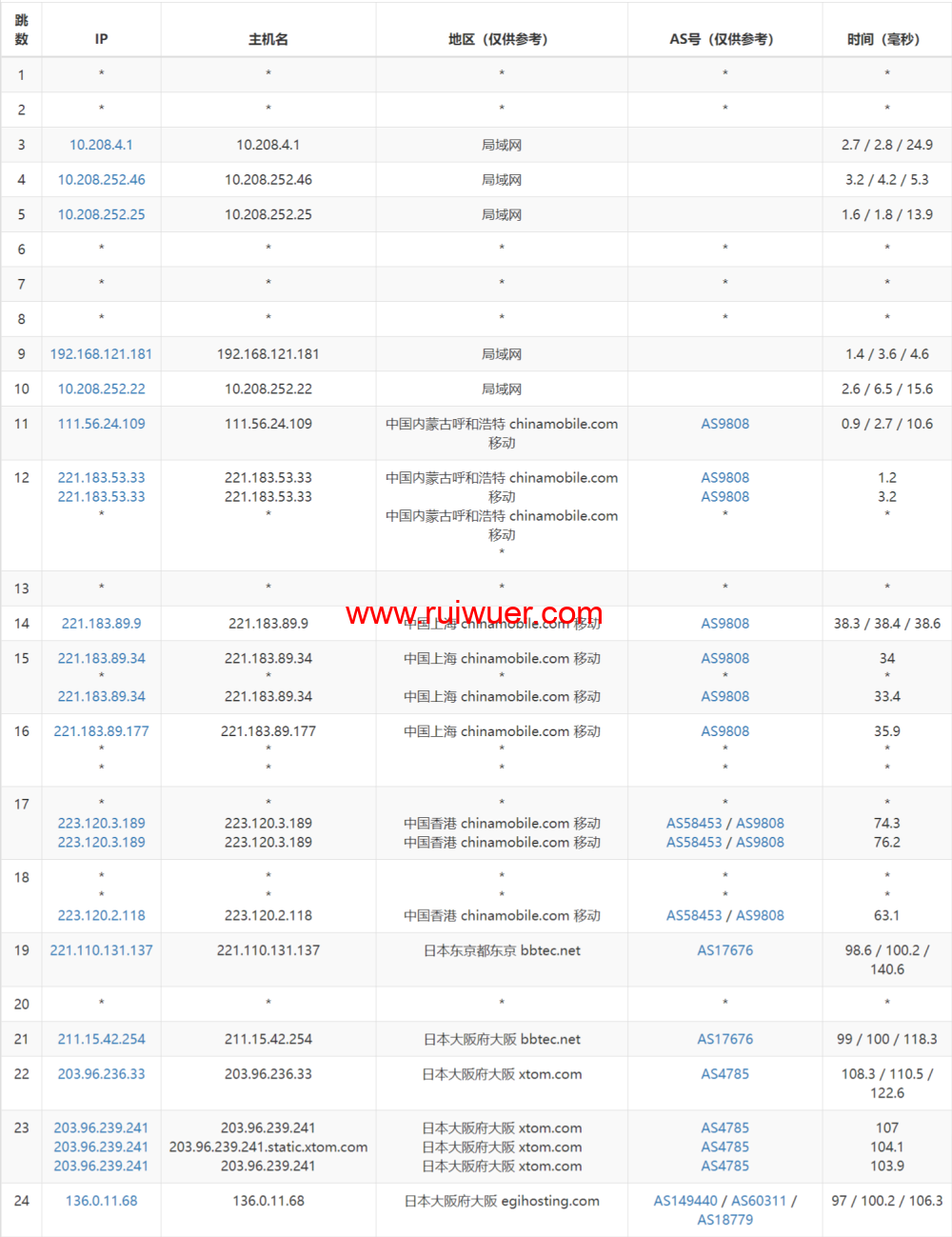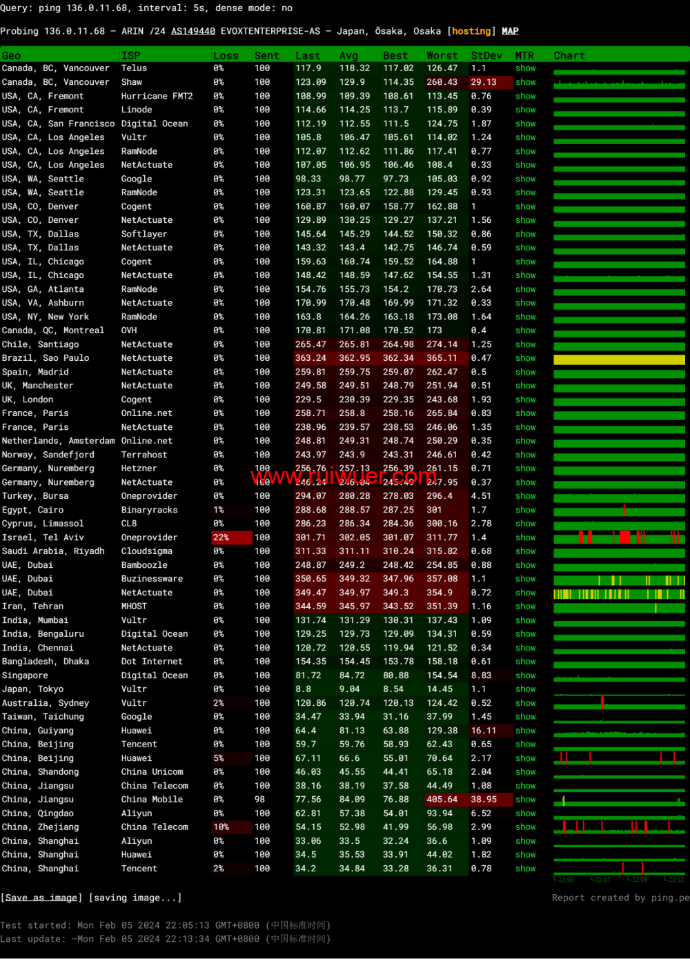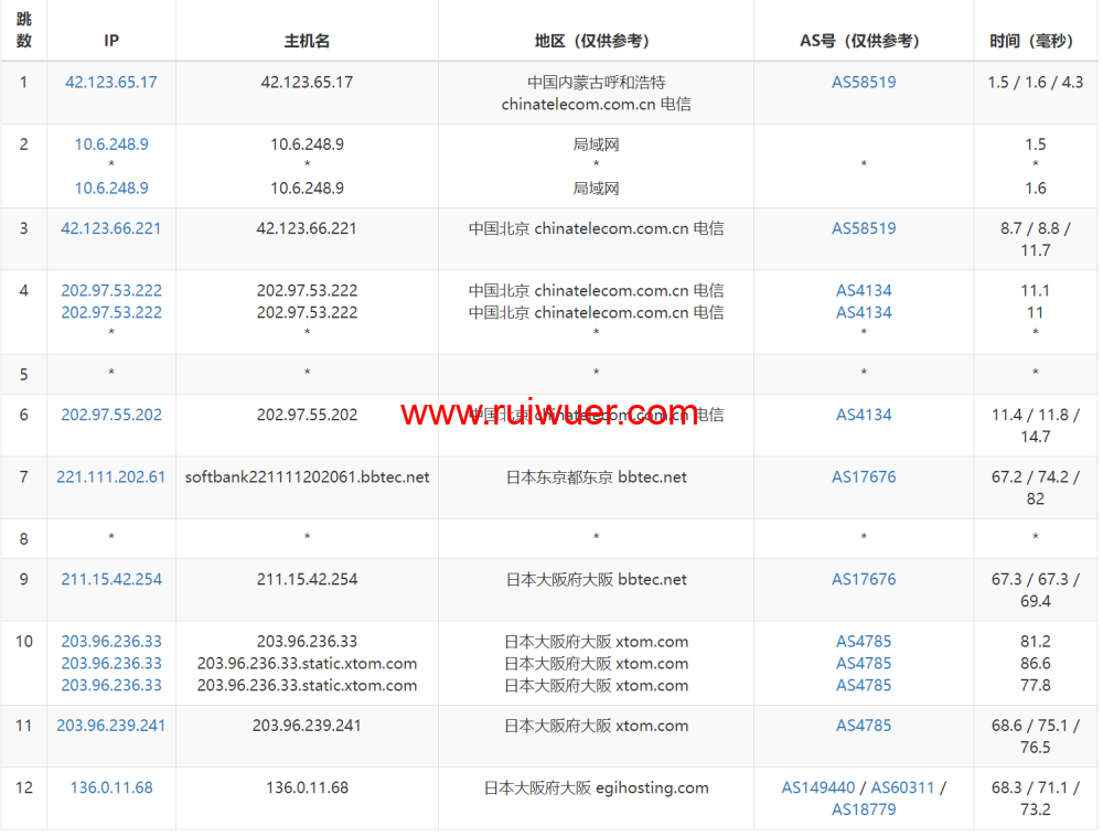 2024/02/17 10:39:44 正在测试三网回程路由 国家: JP 城市: Osaka 服务商: AS149440 Evoxt Enterprise 项目地址: https://github.com/zhanghanyun/backtrace 北京电信 219.141.136.12 电信163 [普通线路] 北京联通 202.106.50.1 联通4837[普通线路] 北京移动 221.179.155.161 移动CMI [普通线路] 上海电信 202.96.209.133 电信163 [普通线路] 上海联通 210.22.97.1 联通4837[普通线路] 上海移动 211.136.112.200 移动CMI [普通线路] 广州电信 58.60.188.222 电信163 [普通线路] 广州联通 210.21.196.6 联通4837[普通线路] 广州移动 120.196.165.24 移动CMI [普通线路] 成都电信 61.139.2.69 电信163 [普通线路] 成都联通 119.6.6.6 联通4837[普通线路] 成都移动 211.137.96.205 移动CMI [普通线路] 2024/02/17 10:39:45 测试完成!