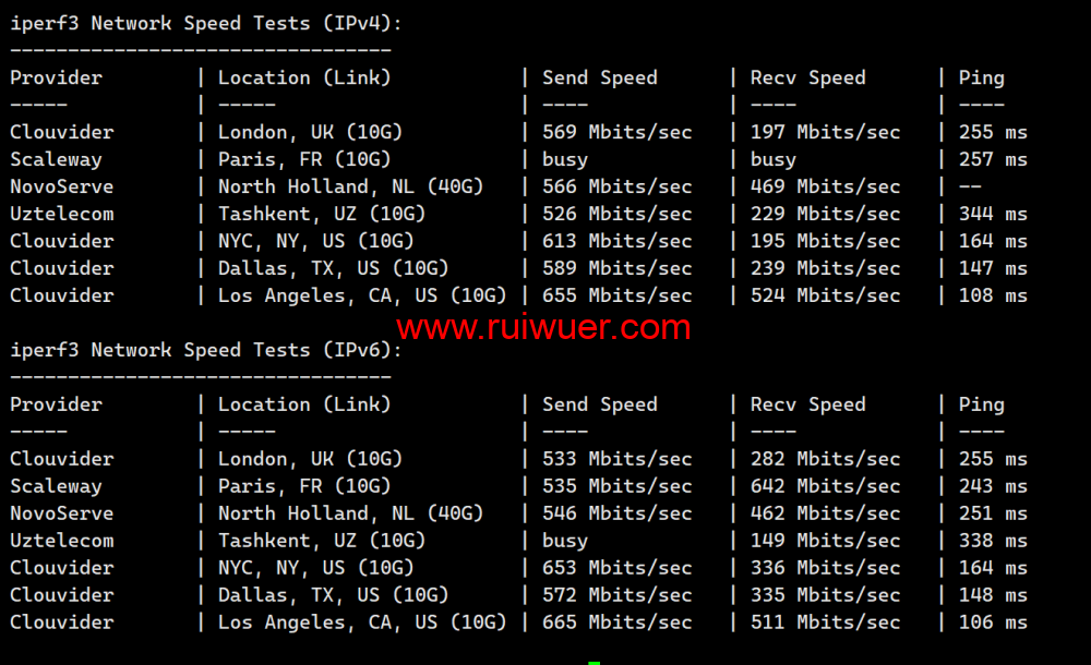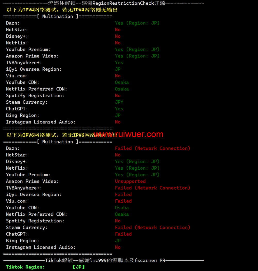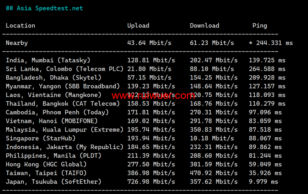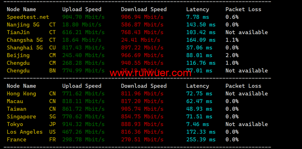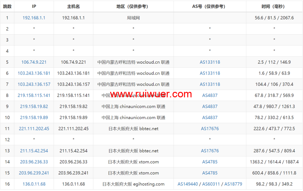 2024/02/17 10:39:44 正在测试三网回程路由 国家: JP 城市: Osaka 服务商: AS149440 Evoxt Enterprise 项目地址: https://github.com/zhanghanyun/backtrace 北京电信 219.141.136.12 电信163 [普通线路] 北京联通 202.106.50.1 联通4837[普通线路] 北京移动 221.179.155.161 移动CMI [普通线路] 上海电信 202.96.209.133 电信163 [普通线路] 上海联通 210.22.97.1 联通4837[普通线路] 上海移动 211.136.112.200 移动CMI [普通线路] 广州电信 58.60.188.222 电信163 [普通线路] 广州联通 210.21.196.6 联通4837[普通线路] 广州移动 120.196.165.24 移动CMI [普通线路] 成都电信 61.139.2.69 电信163 [普通线路] 成都联通 119.6.6.6 联通4837[普通线路] 成都移动 211.137.96.205 移动CMI [普通线路] 2024/02/17 10:39:45 测试完成!