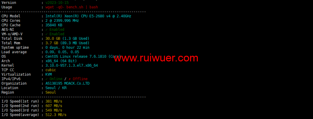 默认CPU为2680V4,使用KVM虚拟化,磁盘IO大致在512.3MB/s