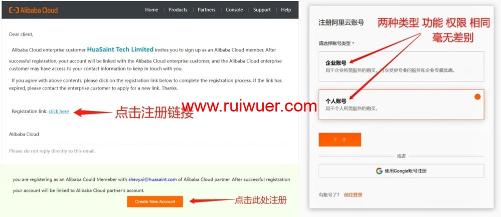 通过 发给您的邀请链接(点击click here)创建新账户,选择账户类型,点击下一步。