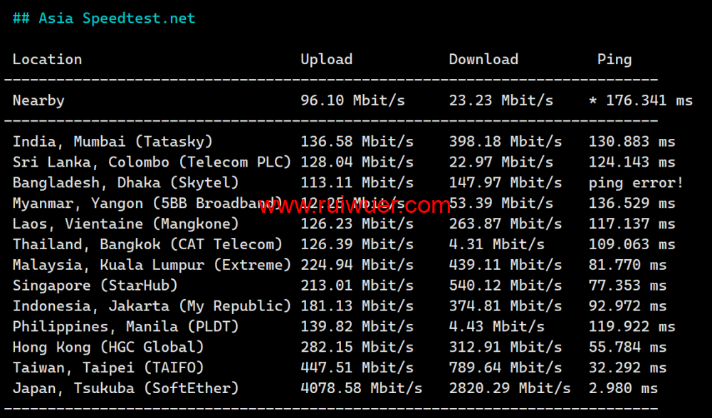 Speedtest亚洲节点上行下行测试: