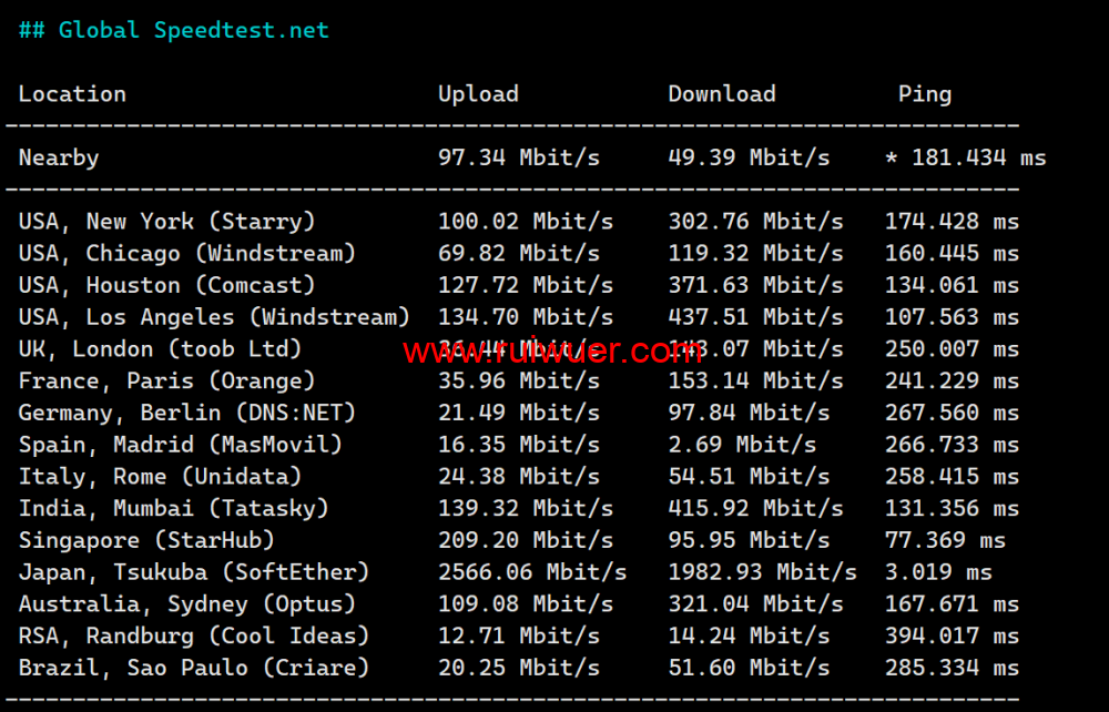 Speedtest全球节点上行下行测试: