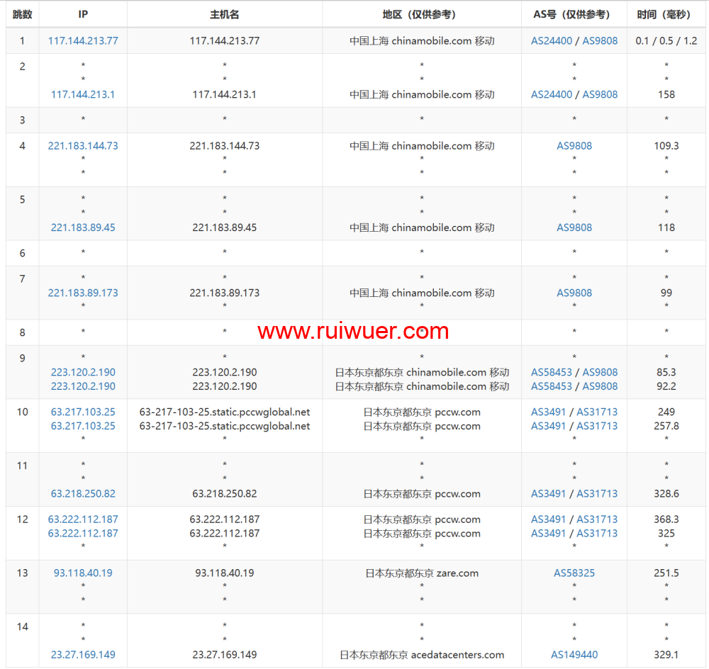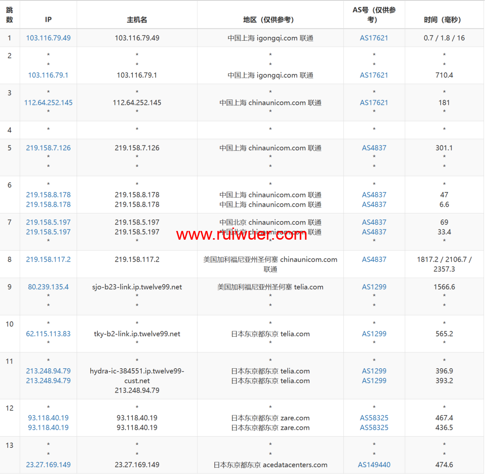 .48.179.152.in-addr.arpa (152.179.48.70) 102.39 ms AS701 美国, 加利福尼亚州, 圣何塞, verizon.com 9 * 10 * 11 * 12 * 13 bj141-162-218.bjtelecom.net (219.141.162.218) 261.07 ms AS4847 中国, 北京, chinatelecom.com.cn, 电信 14 bj141-160-38.bjtelecom.net (219.141.160.38) 259.72 ms AS4847 中国, 北京, chinatelecom.com.cn, 电信 15 * 16 26.68.37.106.static.bjtelecom.net (106.37.68.26) 252.93 ms AS4847 中国, 北京, chinatelecom.com.cn, 电信 Round 5 - SuperTrace 路由到 - 上海电信 -------------------- traceroute to 101.95.89.90 (101.95.89.90), 30 hops max, 32 byte packets 1 10.1.1.21 0.33 ms * 局域网 2 93.118.40.18 0.48 ms AS58325 日本, 东京都, 东京, zare.com 3 * 4 * 5 * 6 63-217-21-126.static.pccwglobal.net (63.217.21.126) 100.77 ms AS3491,AS31713 美国, 加利福尼亚州, 圣何塞, pccw.com 7 0.ae27.GW7.SJC7.ALTER.NET (140.222.5.71) 100.82 ms * 美国, 加利福尼亚州, 圣何塞, verizon.com 8