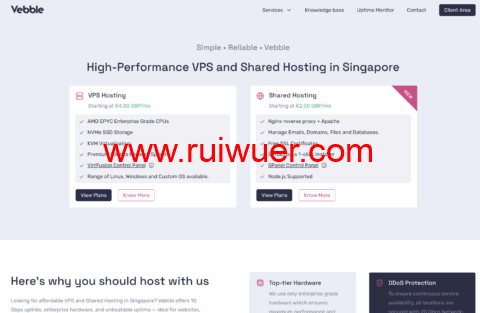 Vebble现在有一个VPS五折促销优惠,适用于除2GB内存以外的全部套餐,节点采用AMD EPYC 7003 CPU,NVMe SSD组RAID10,折后4GB内存套餐低至月付4英镑起。Vebble是2024年成立的国外主机商(好像是webhorizon旗下站),提供虚拟主机和VPS等产品,数据中心在新加坡,10Gbps端口,国际线路,支持使用PayPal或者信用卡付款。