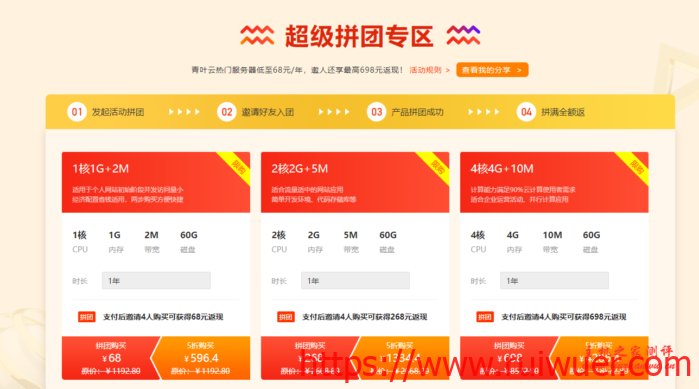 1核1G 2M拼团购买68元/年 支付后邀请4人购买可获得68元返现