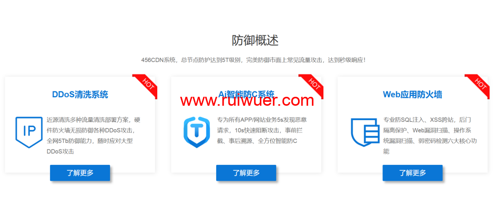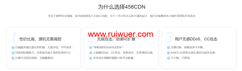 456CDN 专注于各种网络攻击防护,为中小型企业提供高防 CDN、高防 DNS 和 DDOS 防御。它拥有高达 1Tbps 的 DDoS 清洗能力,能够轻松抵御大流量攻击。同时,对 CC 攻击也能做到无视,真正实现了 0 误伤扛 CC 攻击,为用户的服务器和网站安全构筑起坚固的防线。