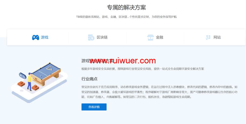 - 网站行业安全解决方案:应对大流量和破坏数据攻击,解决网站经常被恶意流量攻击、被挂马或挂黑链以及 SQL 注入攻击等行业痛点,提供一站式网站安全解决方案。