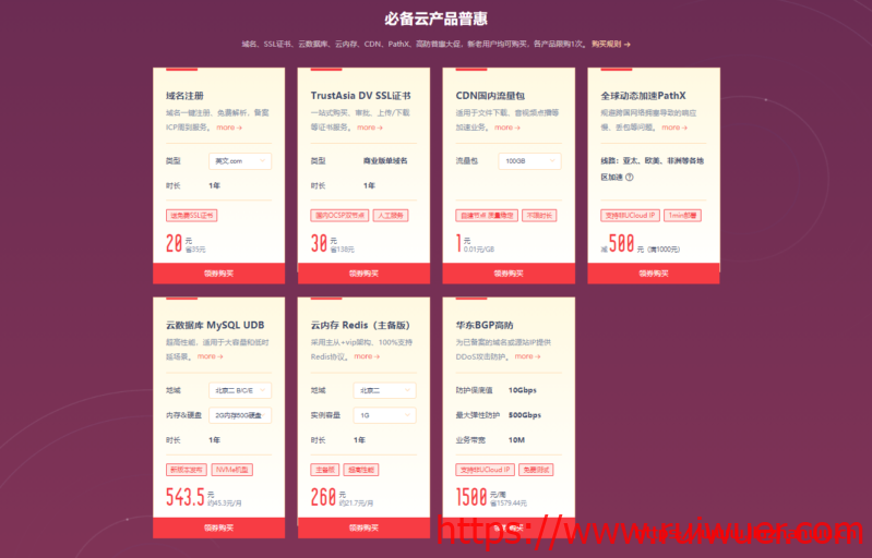 此次UCloud年度促销页面,.com和.cn后缀主流域名注册和域名SSL证书领券位于必备云产品普惠版块,域名、SSL证书、云数据库、云内存、CDN、PathX、高防普惠大促,新老用户均可购买,各产品限购1次。