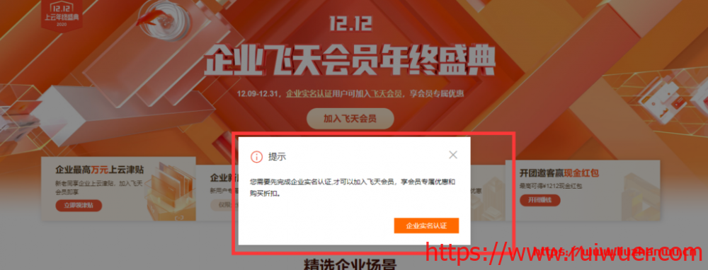 按上述流程完成企业认证后,您就可以成功加入阿里云飞天会员,享受本次双12的爆款产品的飞天会员价。