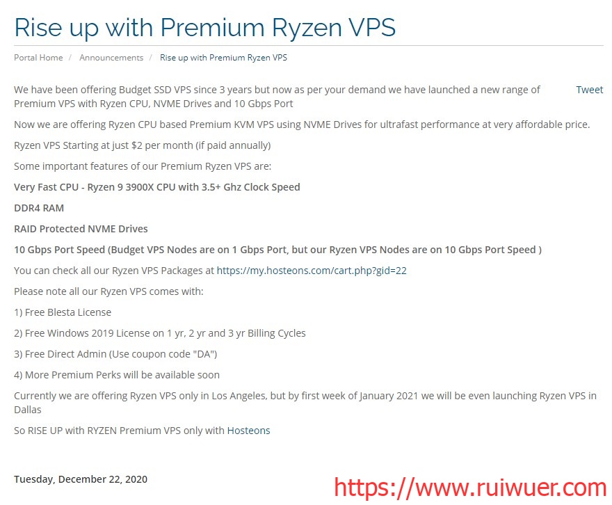 Hosteons,新加坡主机商,正规注册公司(Registration No.: 201806413N),其VPS基于KVM,数据中心有洛杉矶psychz、洛杉矶INAP、纽约等。现在新出了Ryzen 9 3900X处理器的KVM VPS,暂时仅有洛杉矶,之后会推出达拉斯。10Gbps端口。