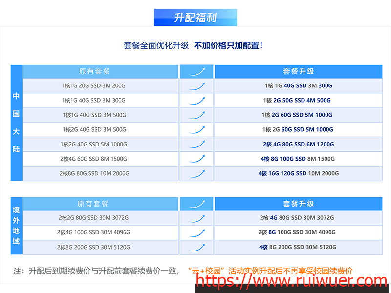 购买完成后,下面就是升级了,因为学生机的配置为1核/2G/40G/1000G流量/5Mbps,我们直接到活动页面去升级。