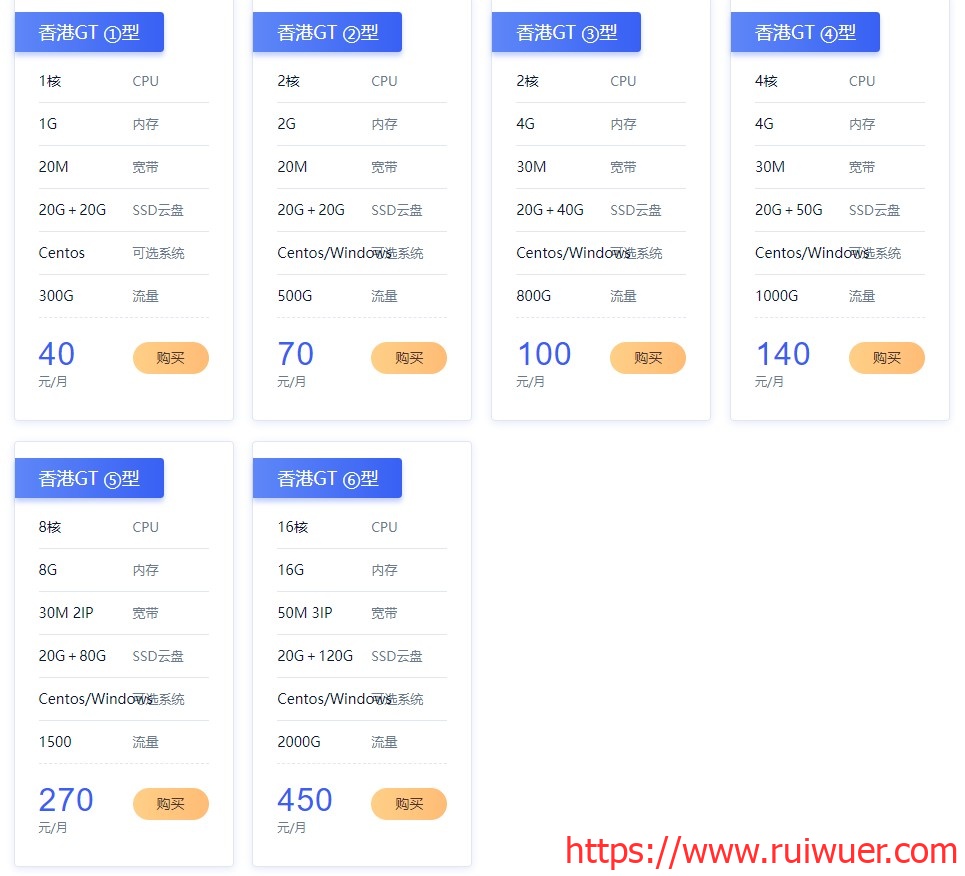 | 香港GT ⑤型 | 8核 | 8G | 30M 2IP | 20G+80GSSD云盘 | Centos/Windows可选系统 | 1500 | 270元/月 | 点此直达 |