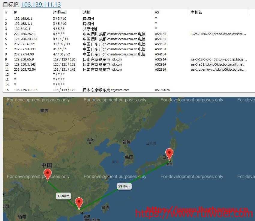 可以看到去程和回程路由都是直连的,所以线路还是不错的。
